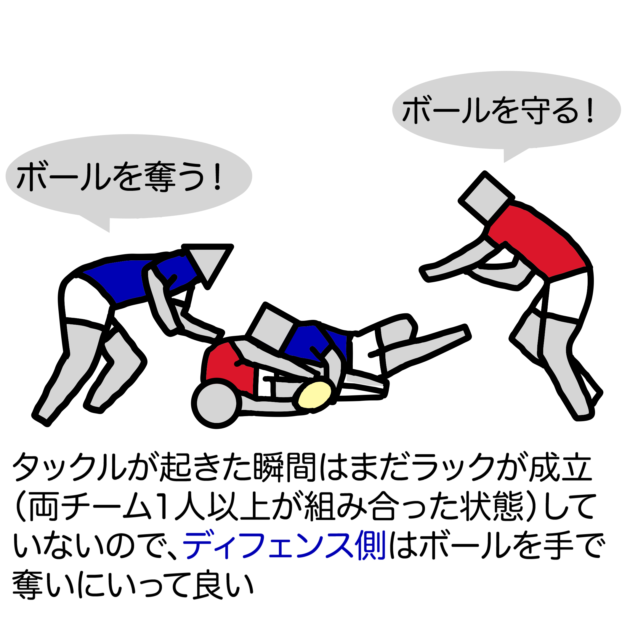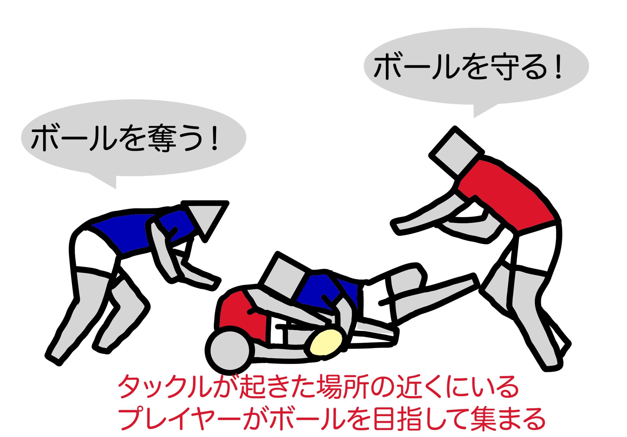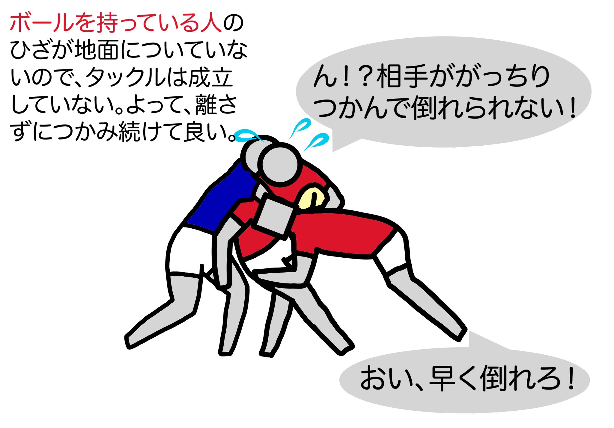 タックルはボールを持っている選手の膝(片方でも)か腰がついたら成立する。 ボールを持っている選手を抱き抱えてボールを出させないようにすると反則(パイルアップ)となりスクラムになるが、膝がついていたら、離さなければならない。