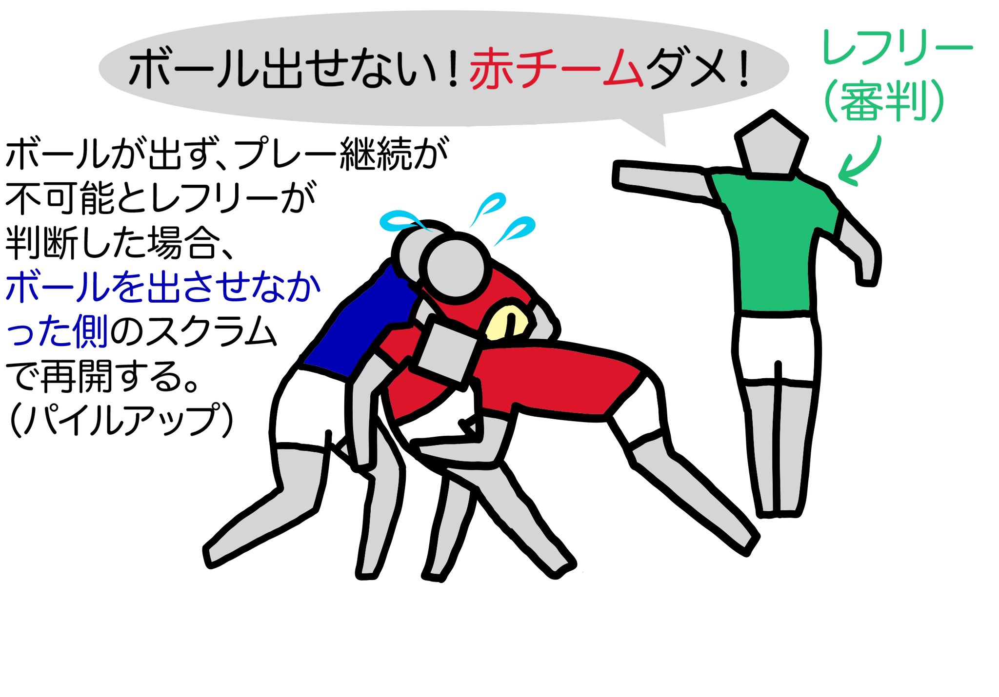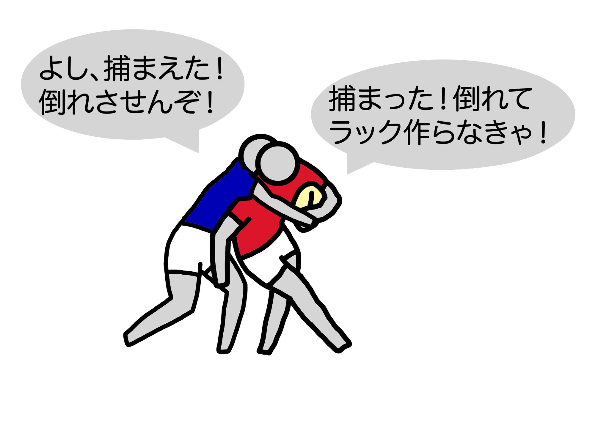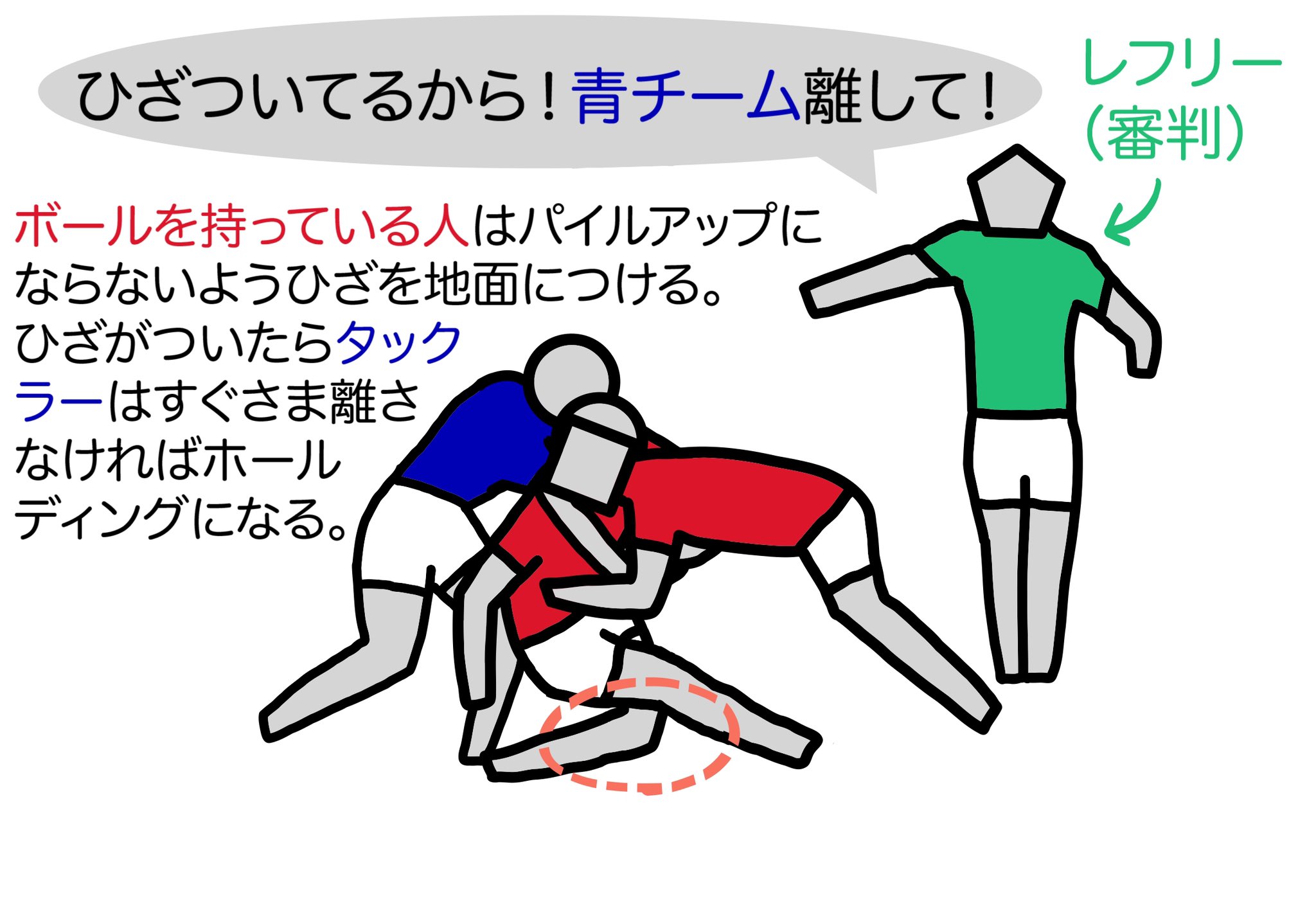 タックルはボールを持っている選手の膝(片方でも)か腰がついたら成立する。 ボールを持っている選手を抱き抱えてボールを出させないようにすると反則(パイルアップ)となりスクラムになるが、膝がついていたら、離さなければならない。
