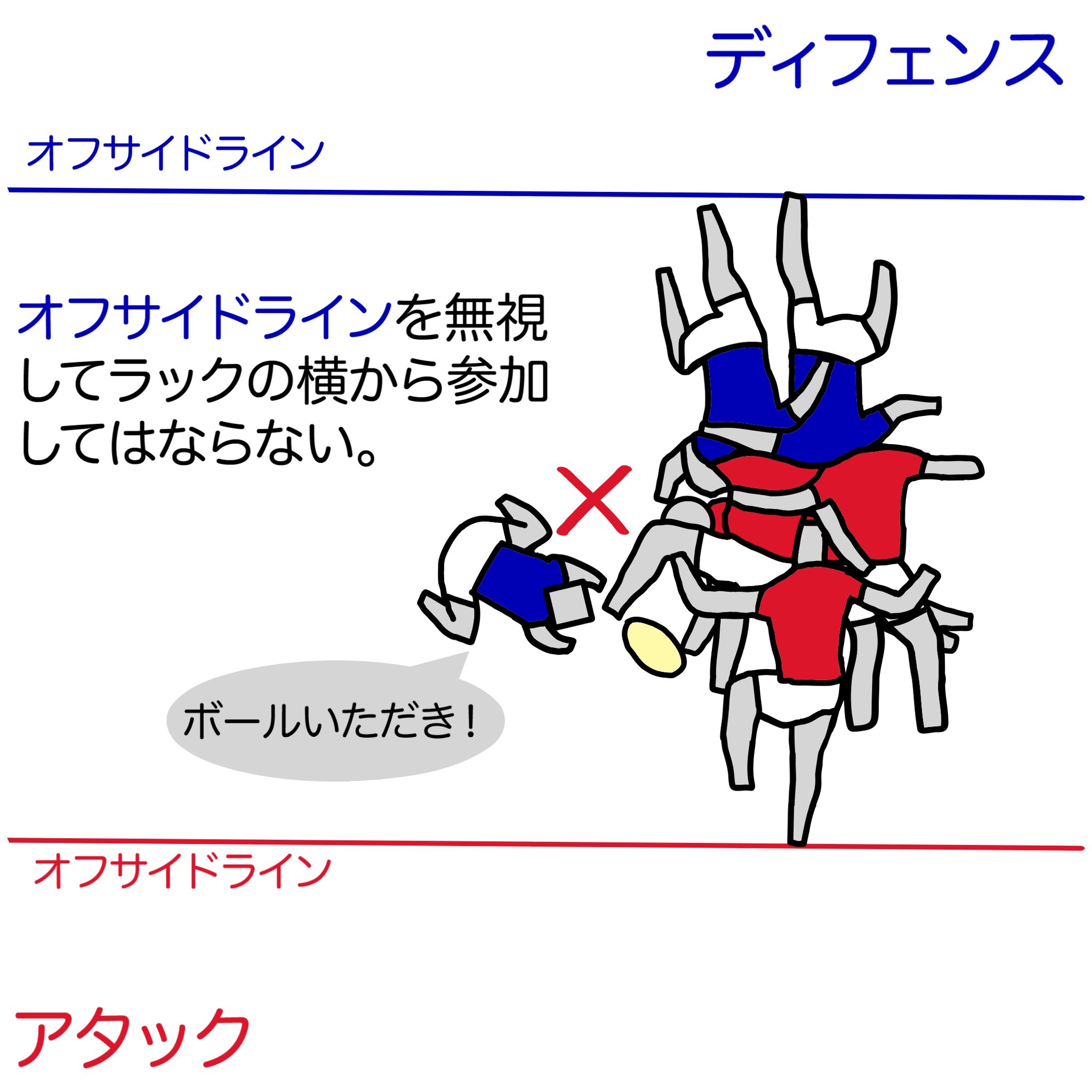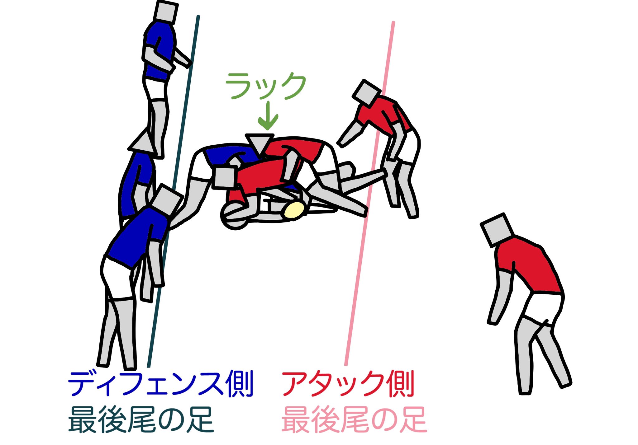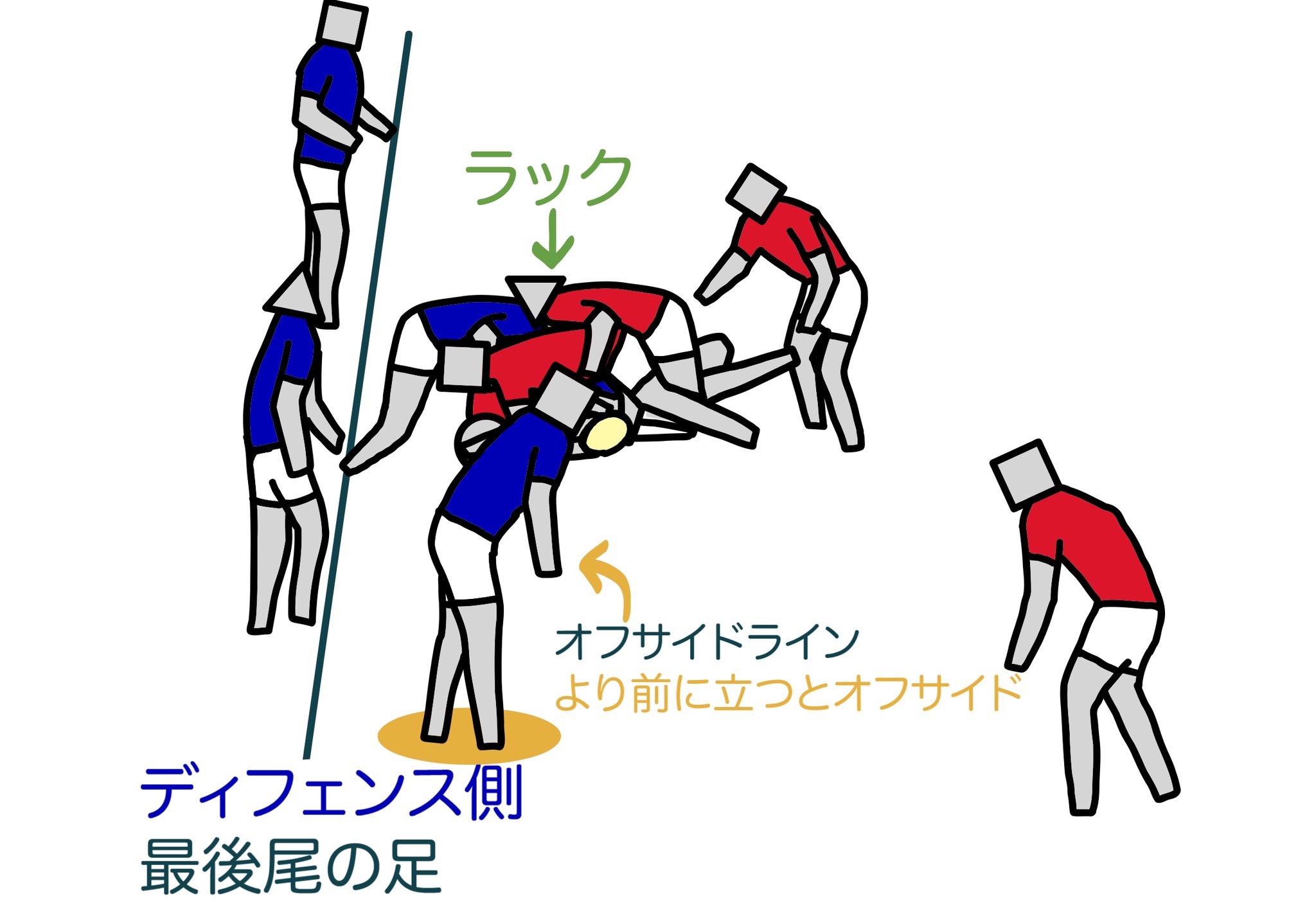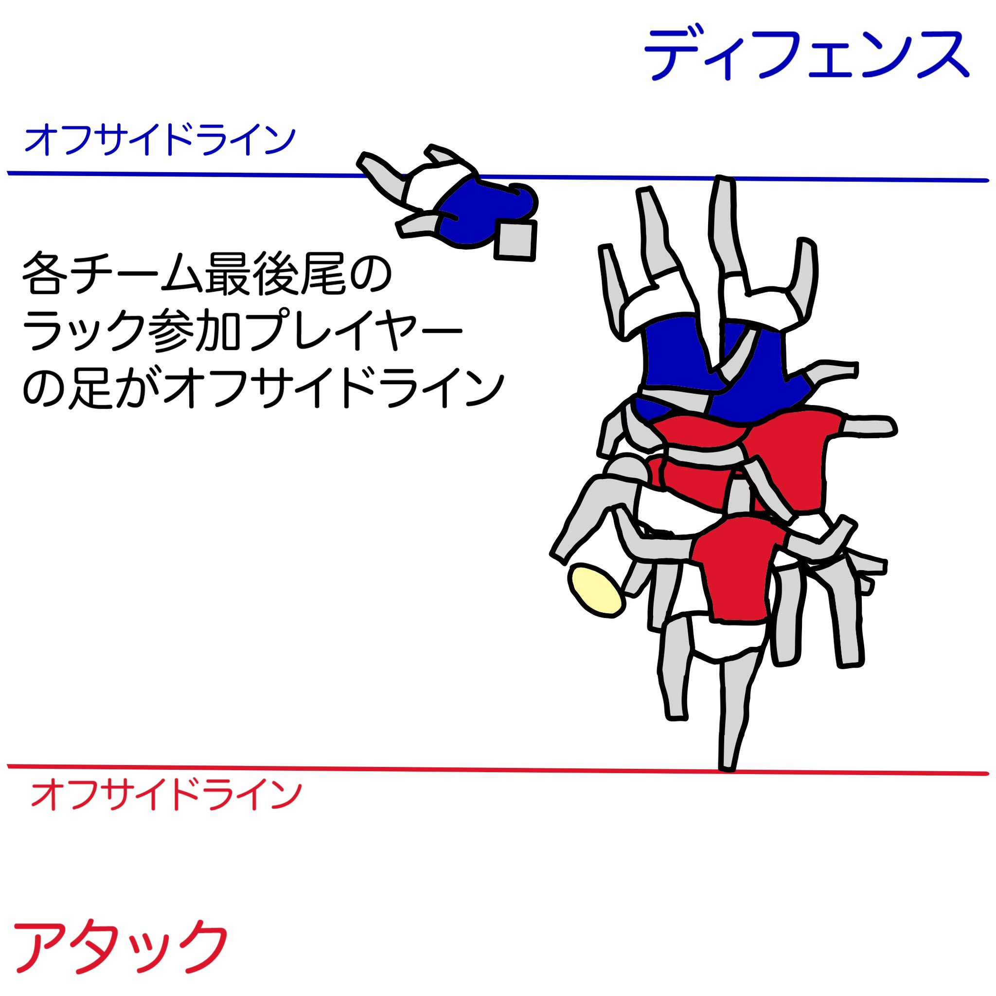ラック形成後、各チーム最後尾のラック参加プレイヤーの足がオフサイドラインとなる。各チームはオフサイドラインを超えた位置でプレーしてはならない。