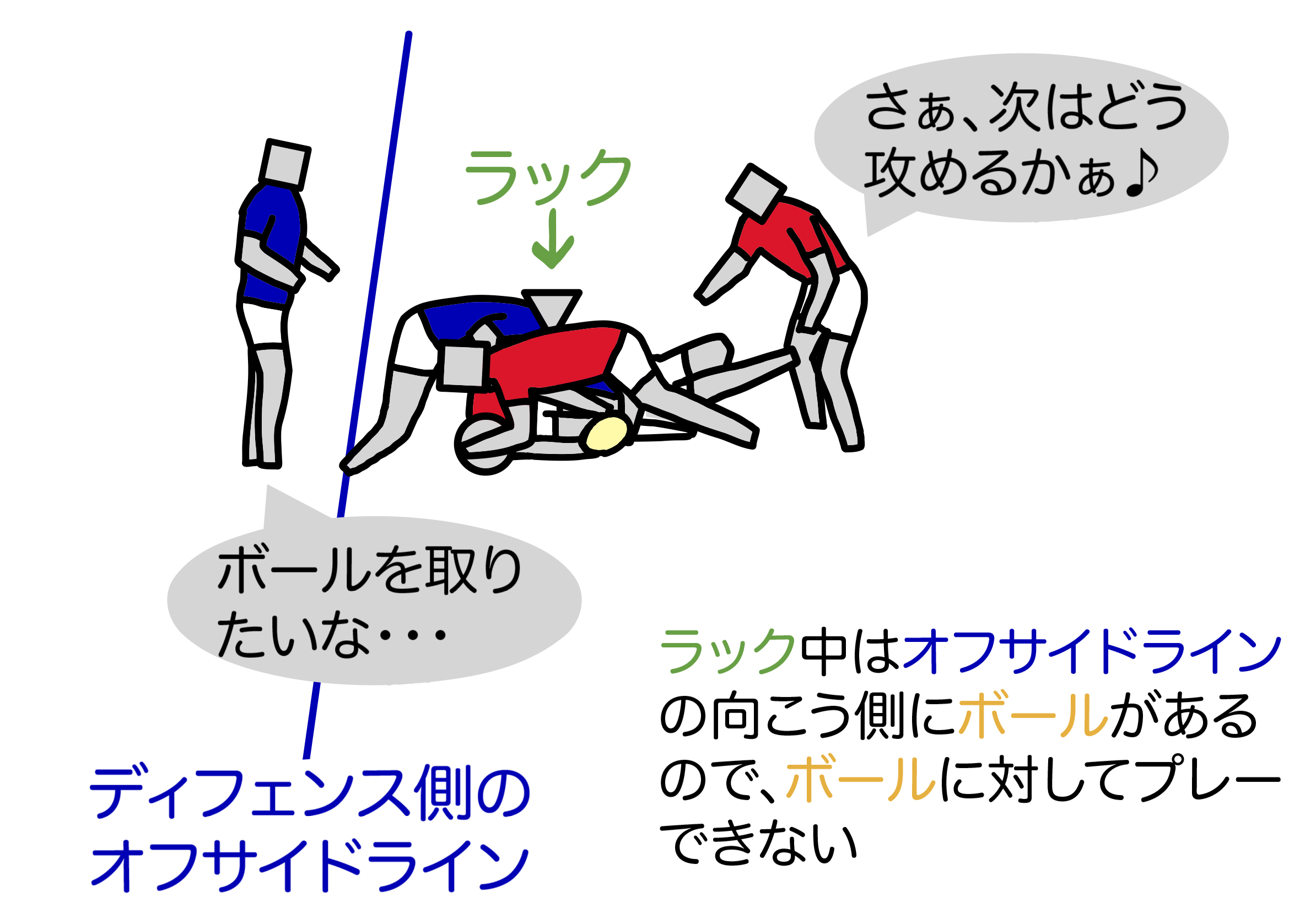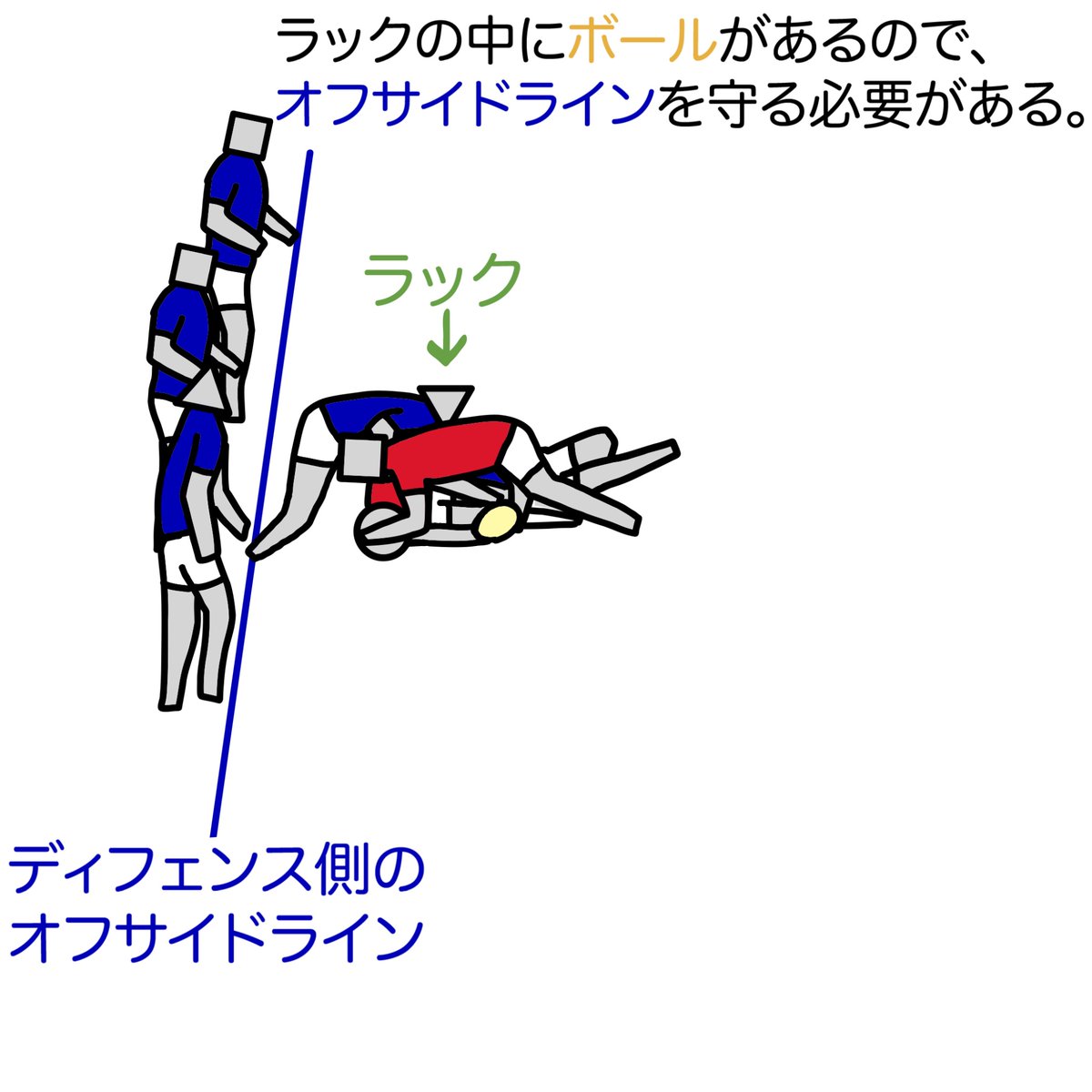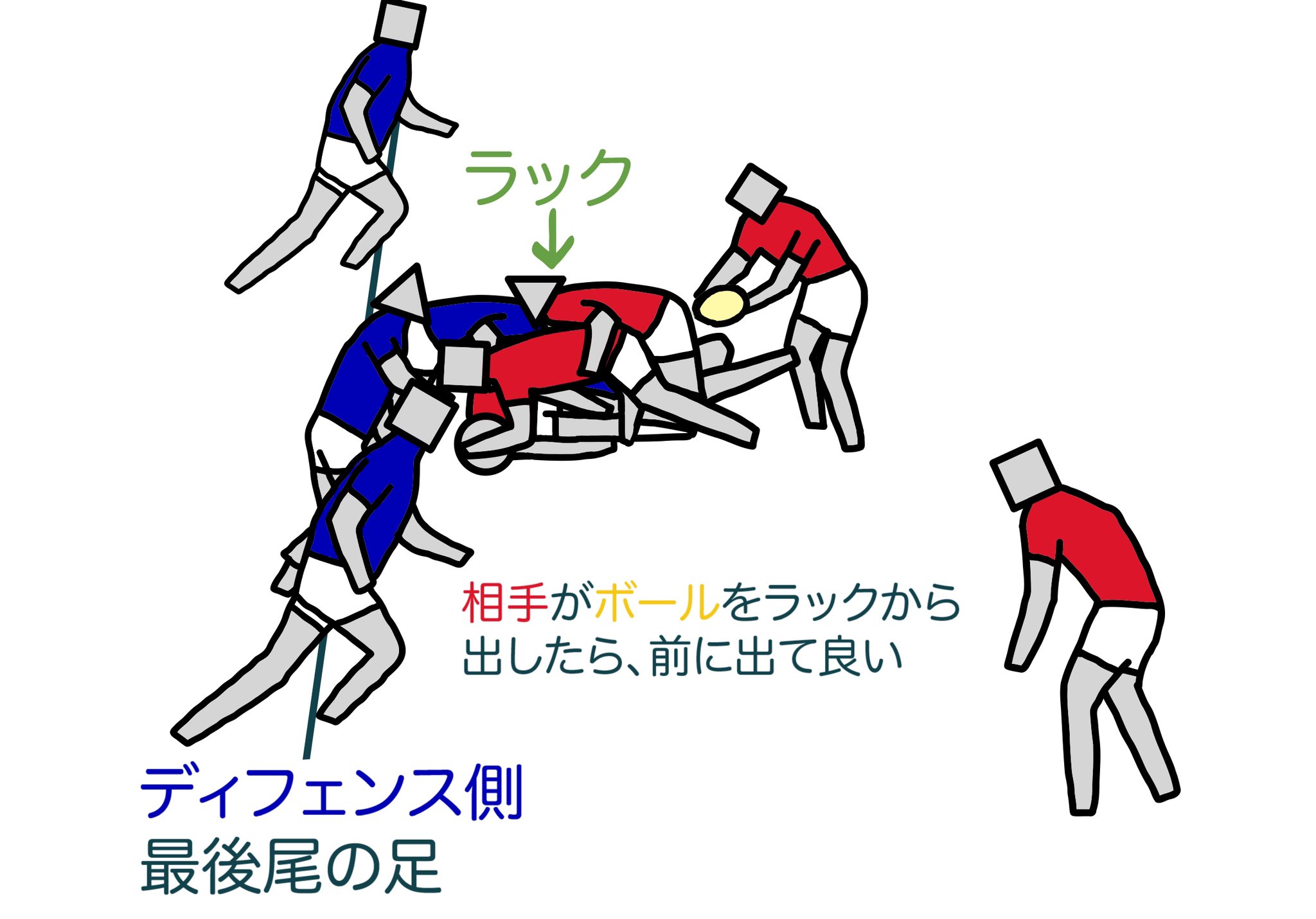 ラック形成後、各チーム最後尾のラック参加プレイヤーの足がオフサイドラインとなる。各チームはオフサイドラインを超えた位置でプレーしてはならない。