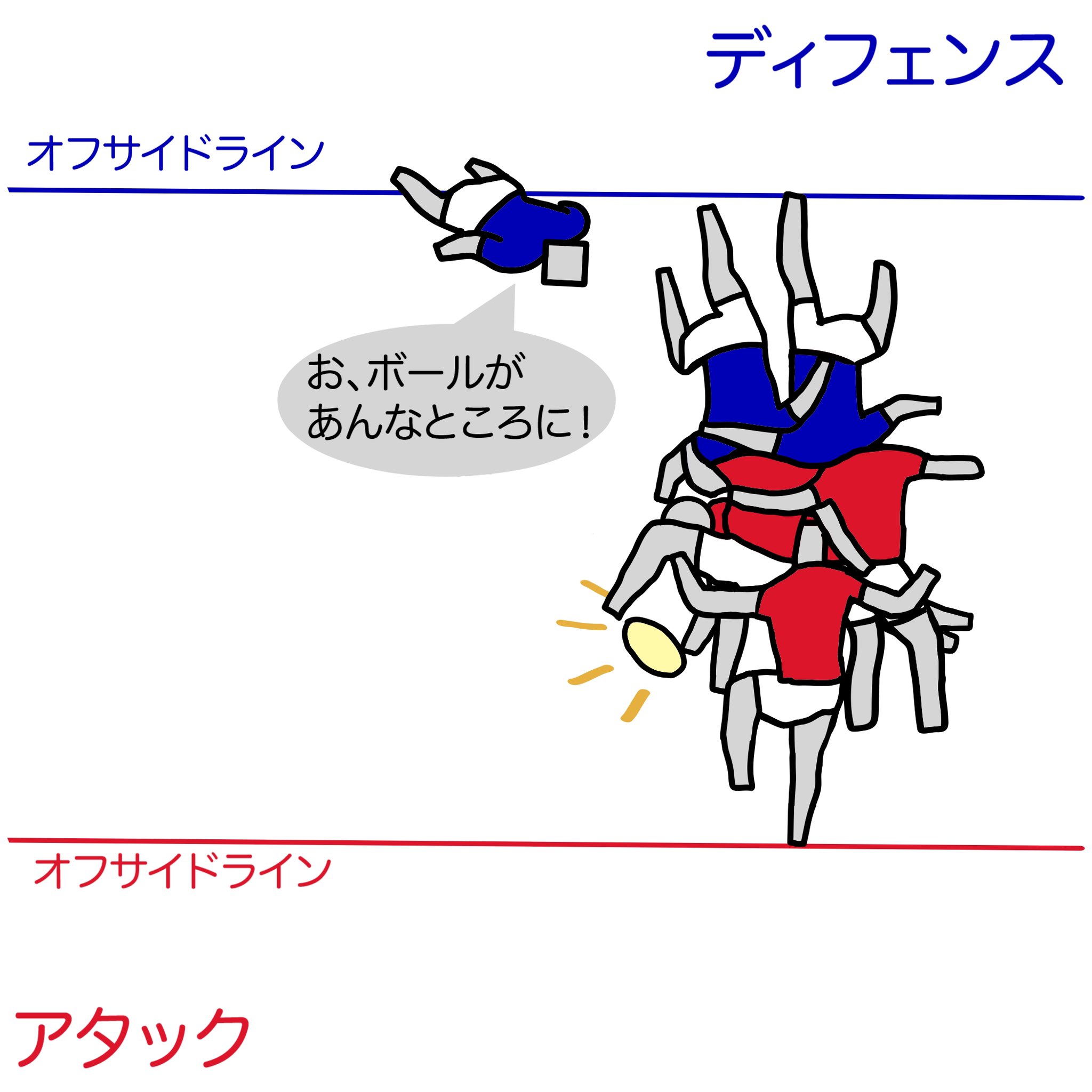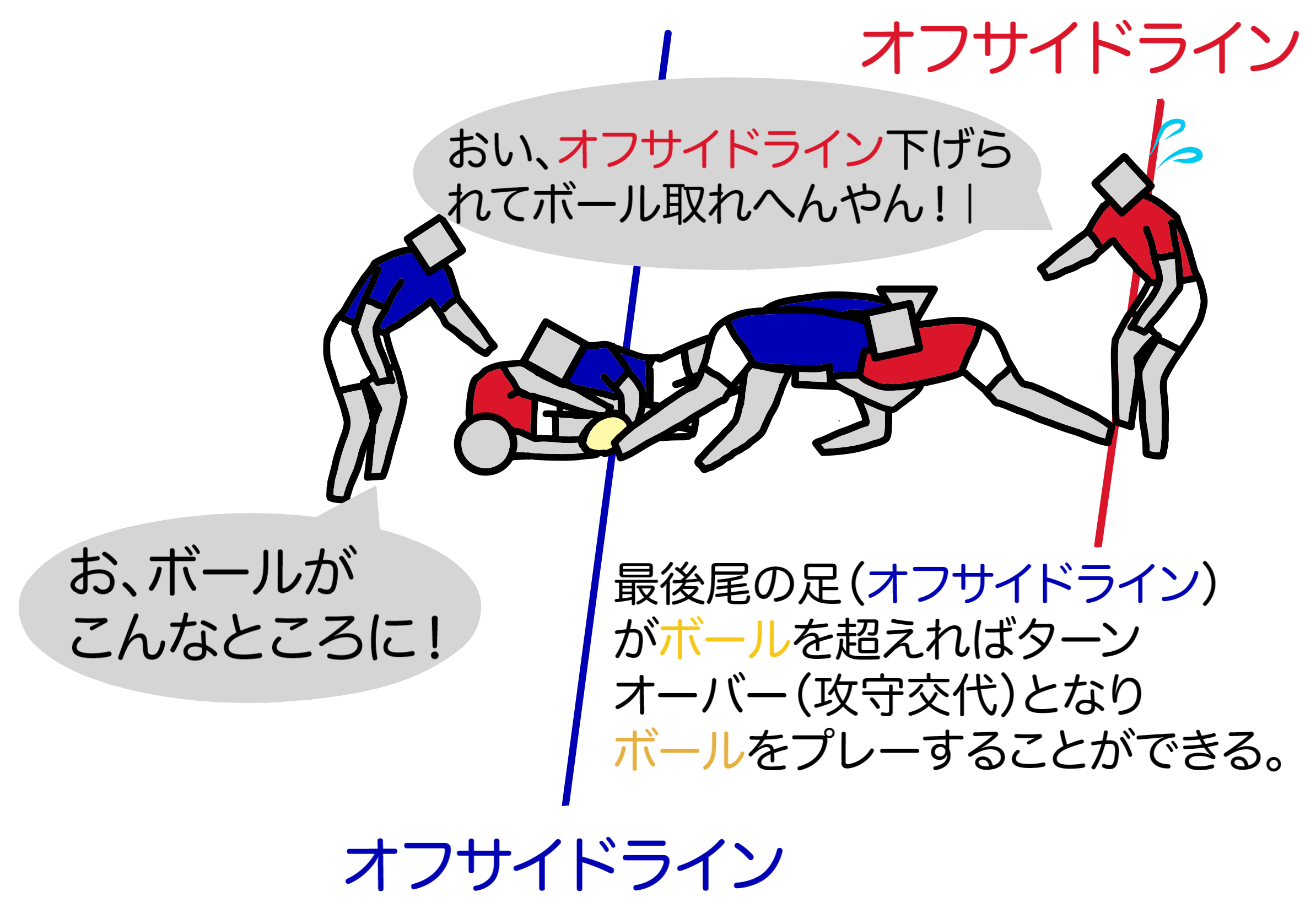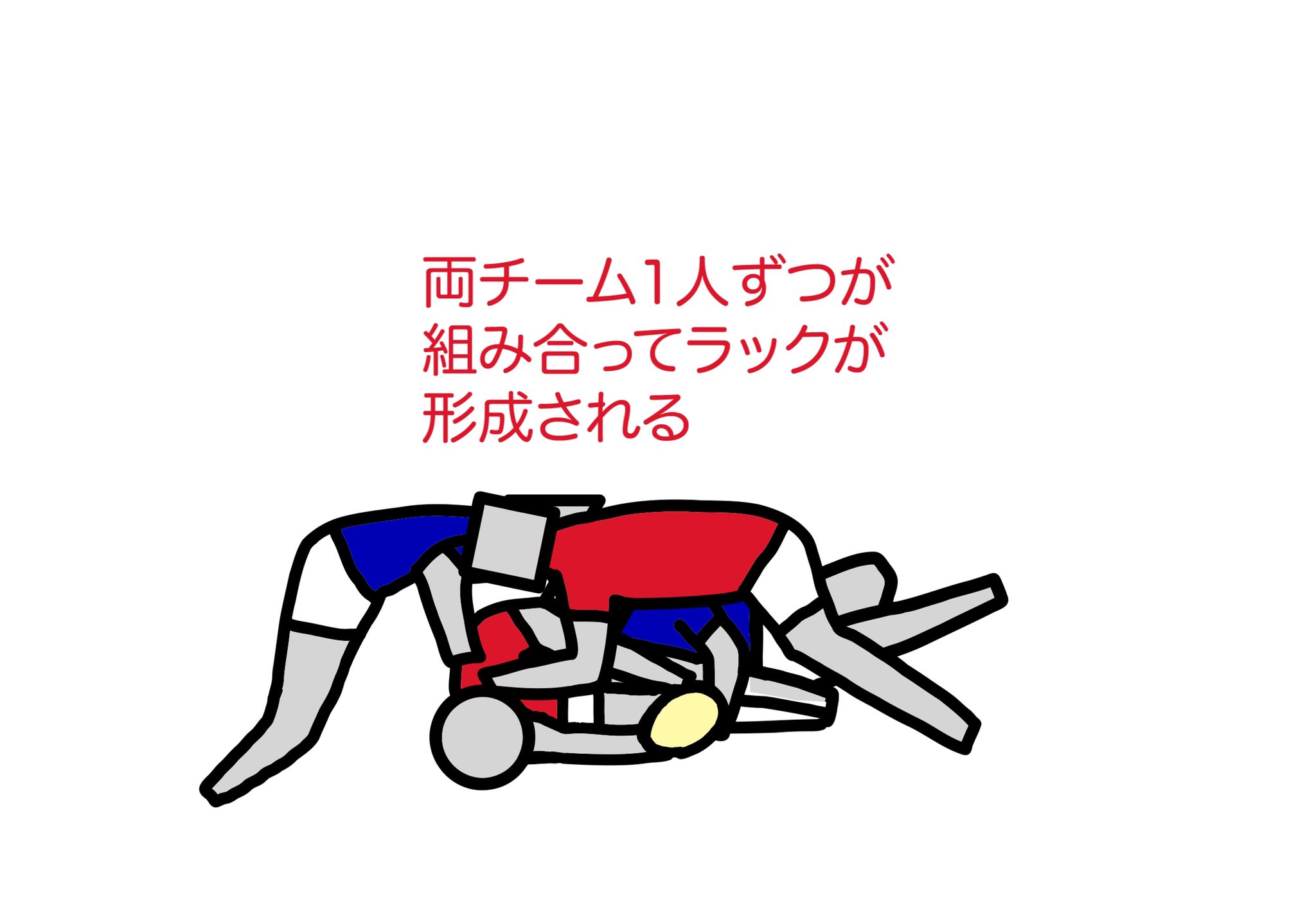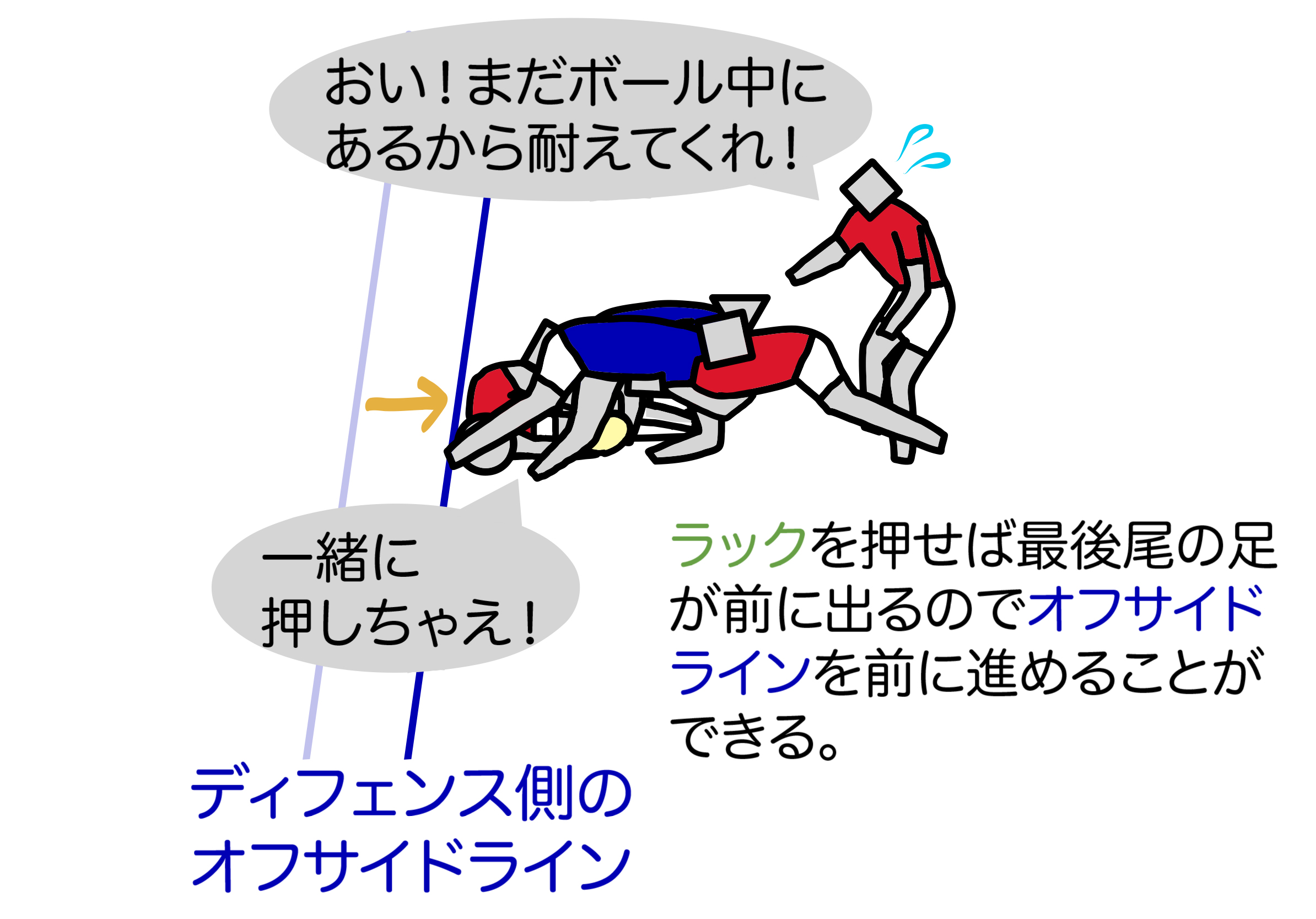ラック形成後、各チーム最後尾のラック参加プレイヤーの足がオフサイドラインとなる。各チームはオフサイドラインを超えた位置でプレーしてはならない。