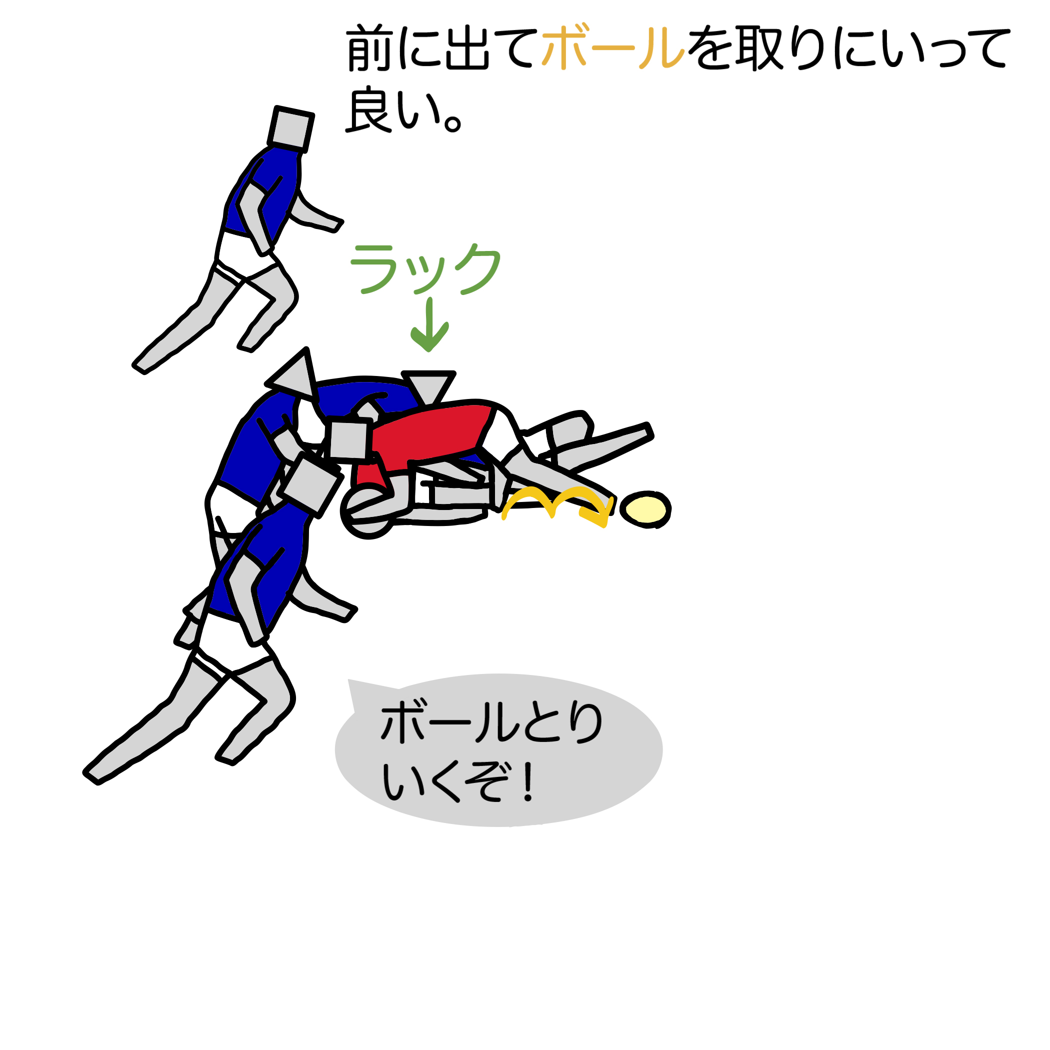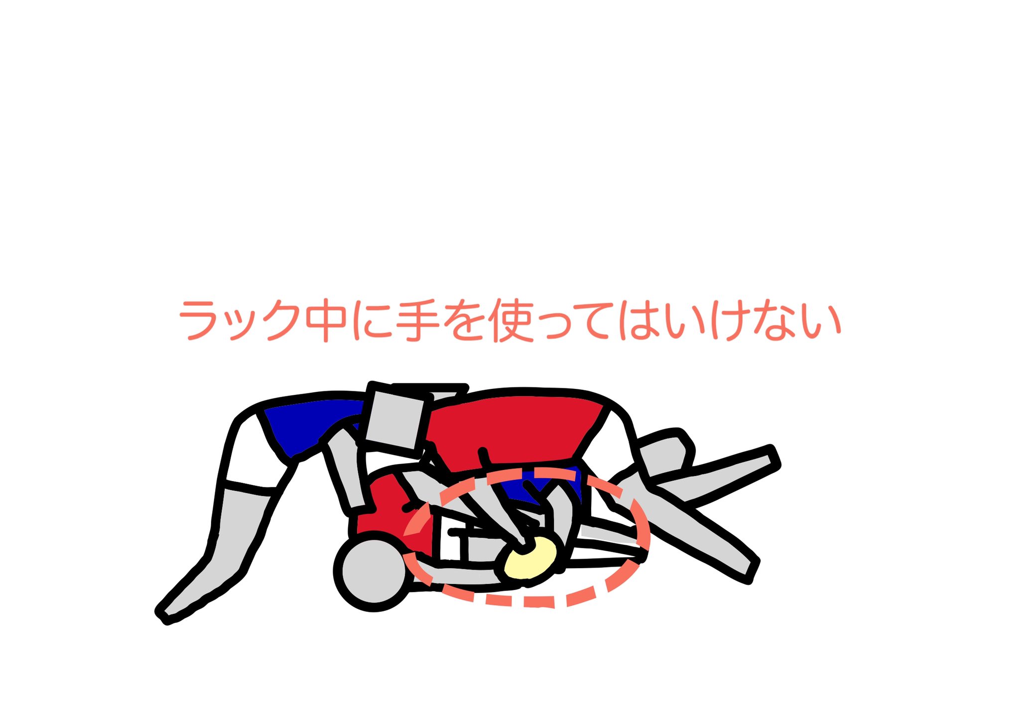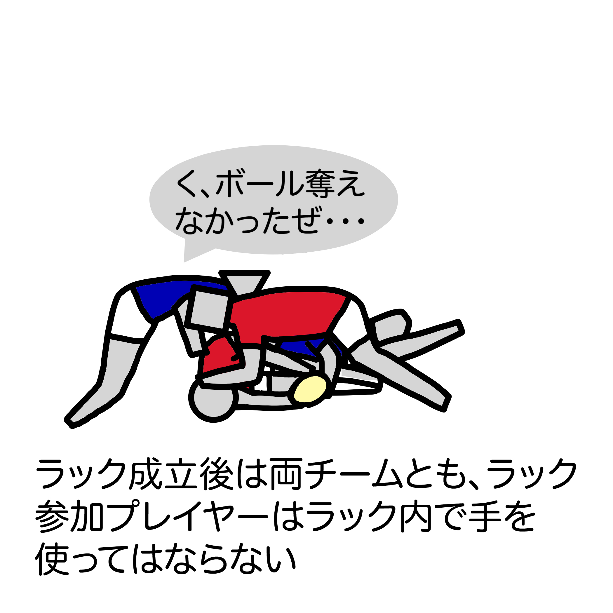 ラックが形成されたら手を使ってはいけない。ラックは両チームが1人ずつ組み合ってから成立するので、スチールをする際は、組み合う前にすみやかにボールに手をかける必要がある。