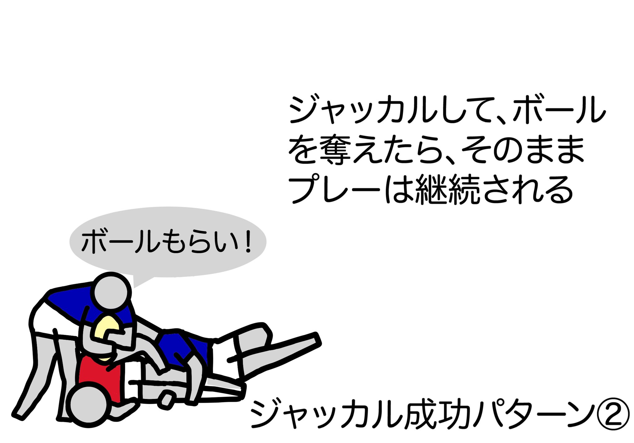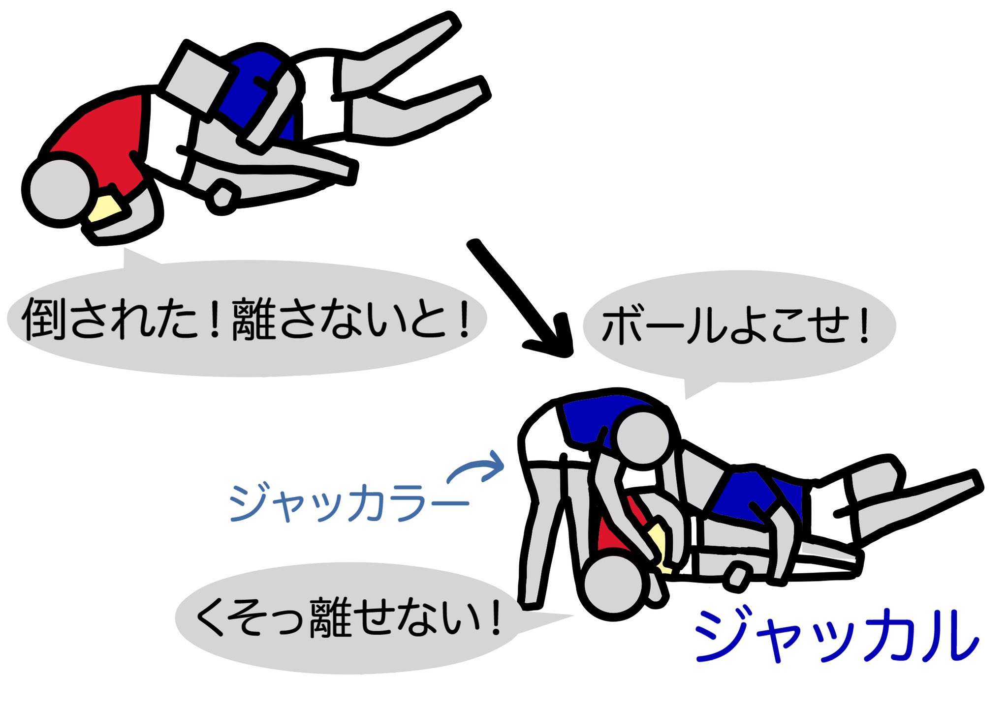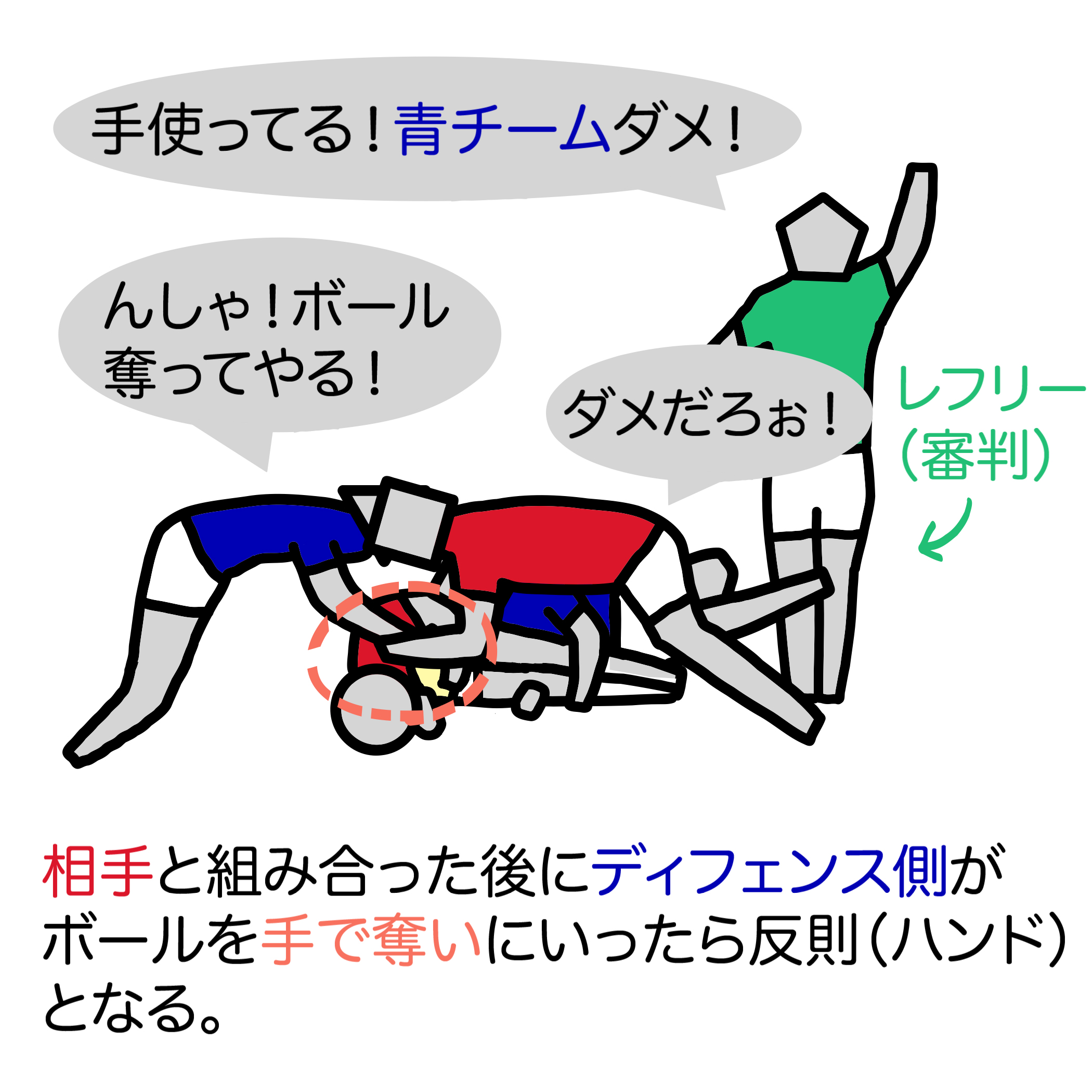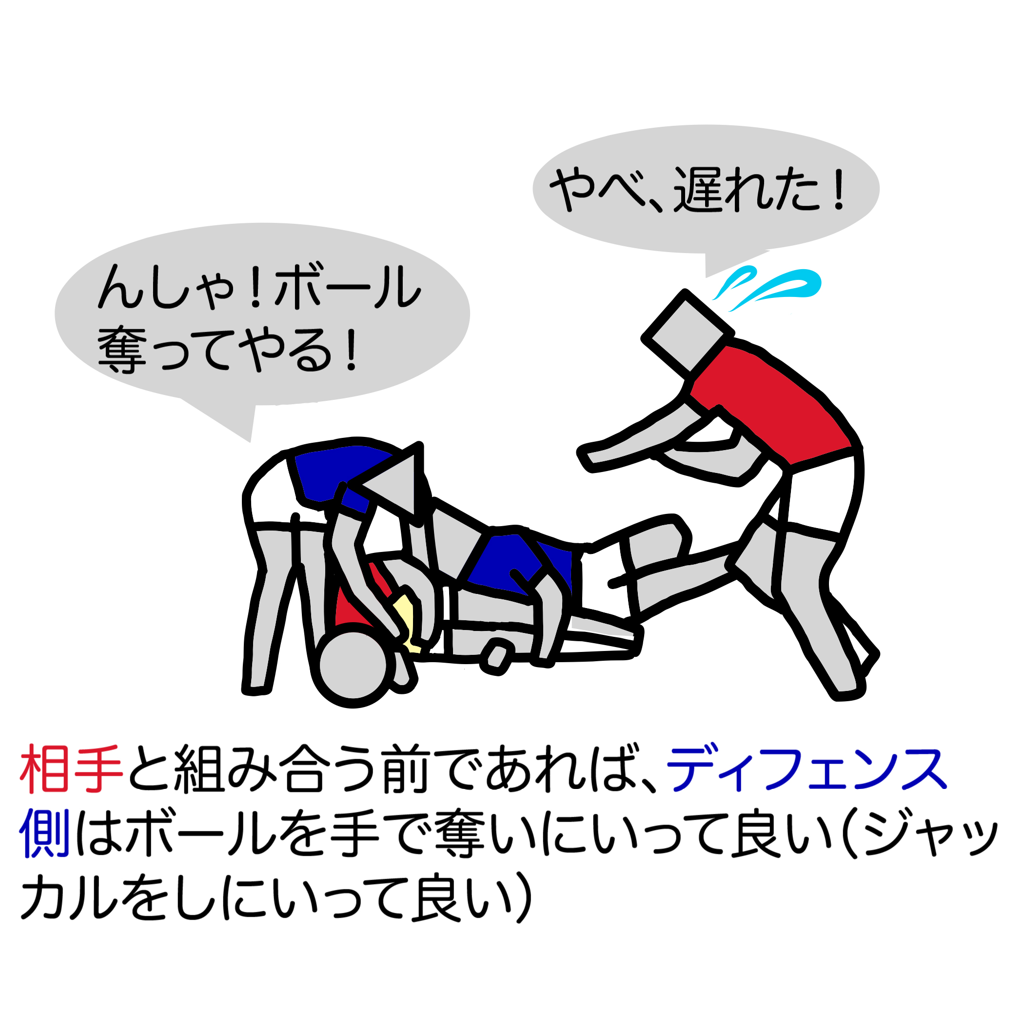 ラックが形成されたら手を使ってはいけない。ラックは両チームが1人ずつ組み合ってから成立するので、スチールをする際は、組み合う前にすみやかにボールに手をかける必要がある。