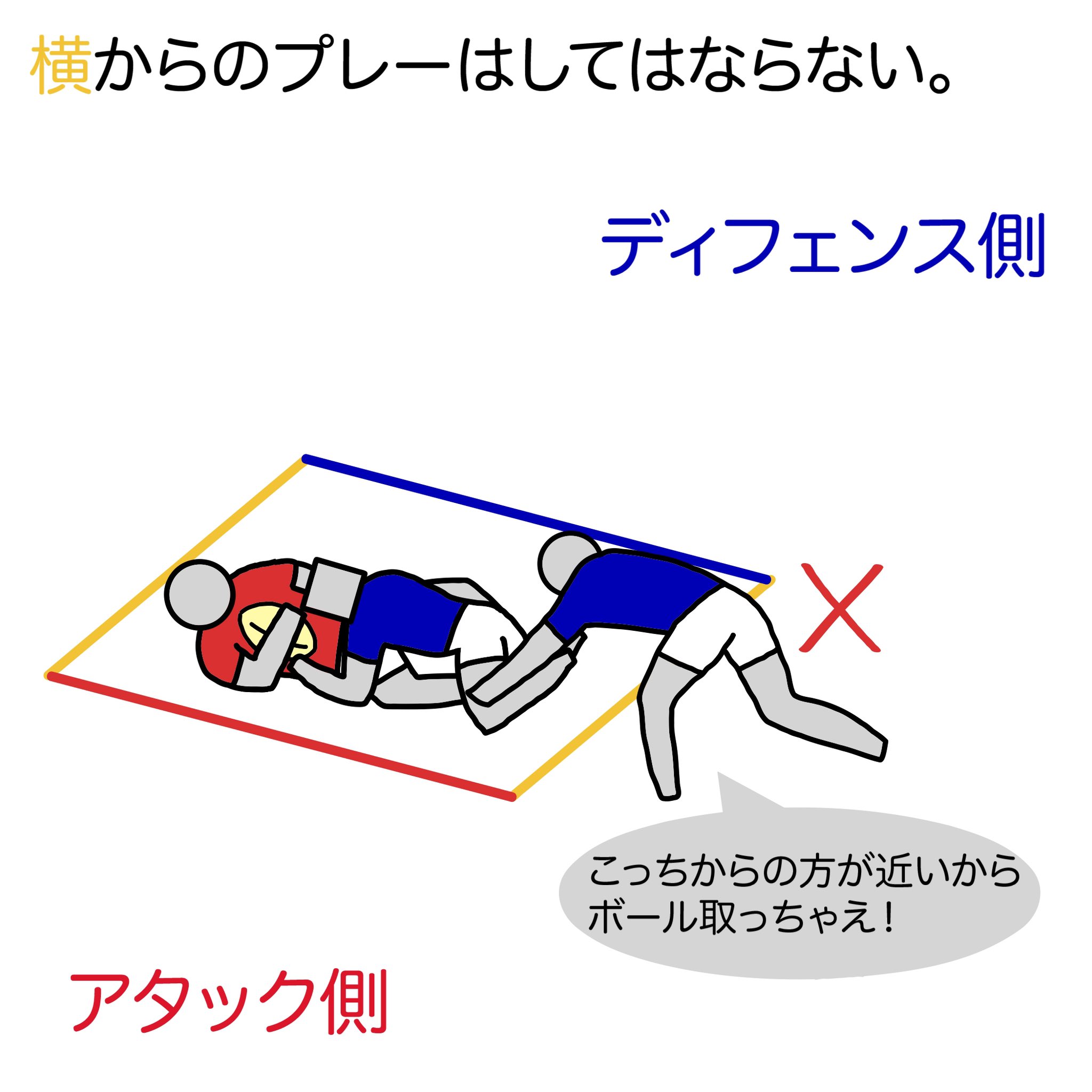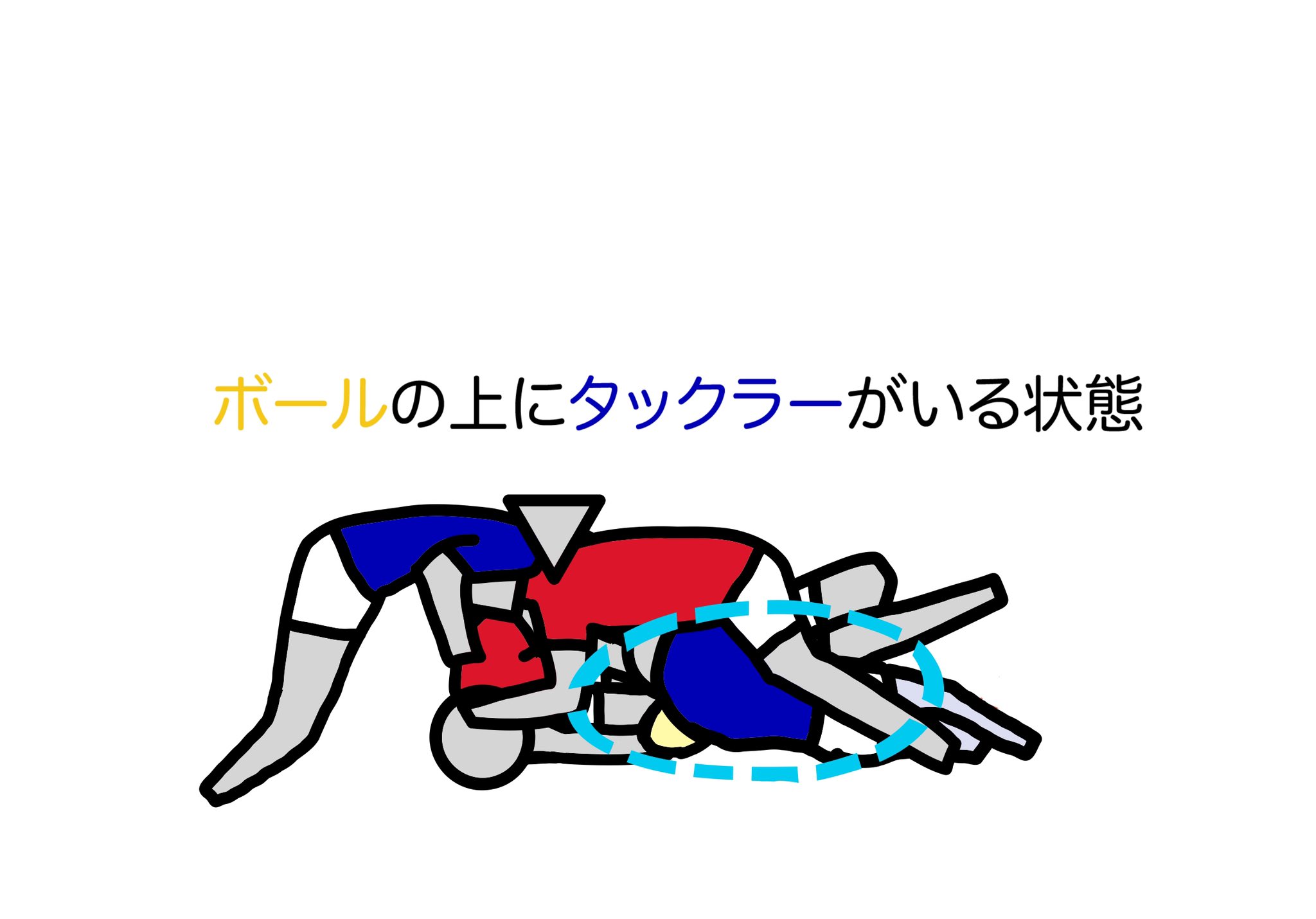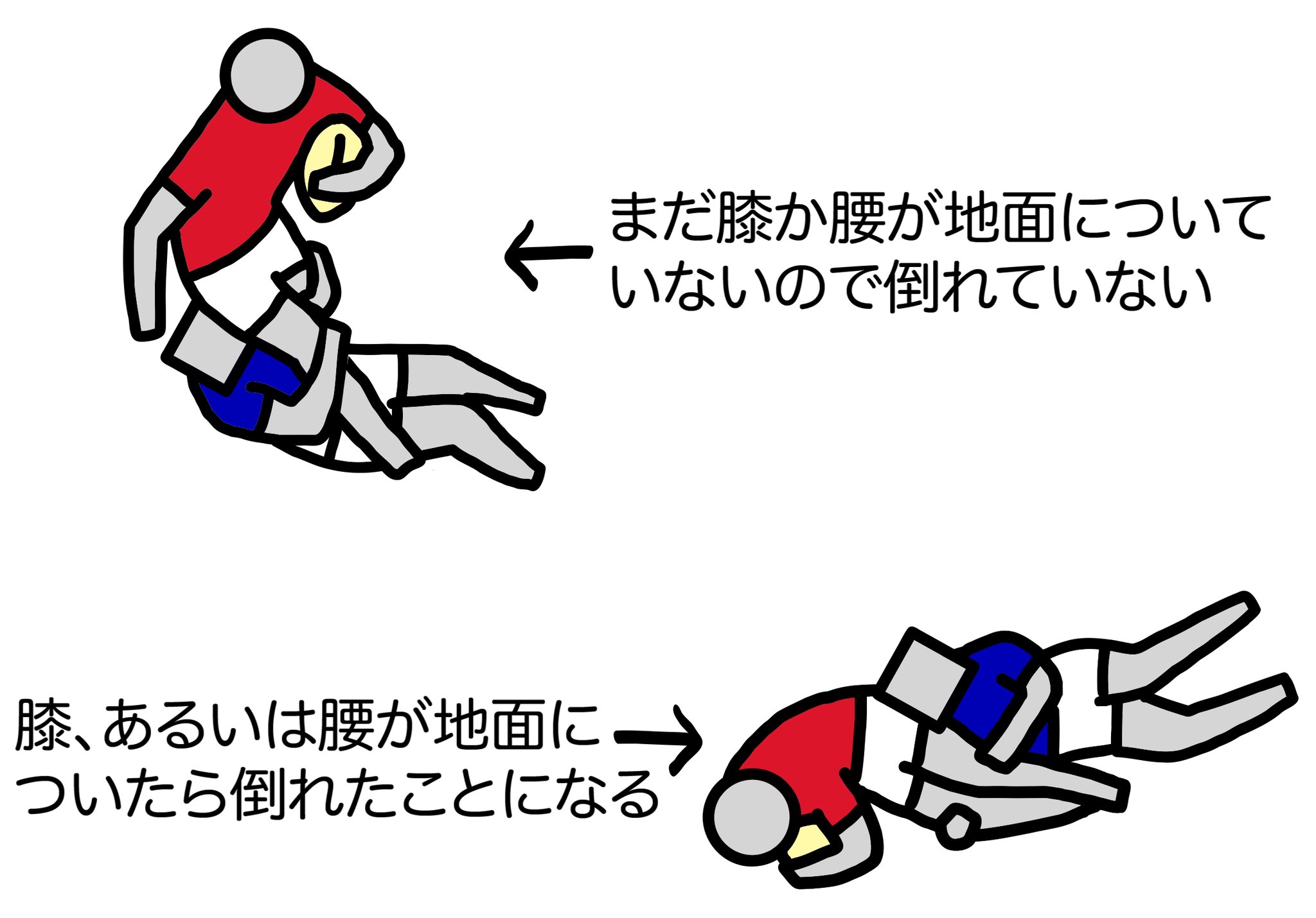 ラグビーにおける「倒れている状態」とは、膝(片方でも)か腰が地面についた状態、あるいは地面に倒れた人の上に膝か腰がついた状態である。倒れている選手は攻守に関わらず、ボールを持ったり、取ったりしてはならない。