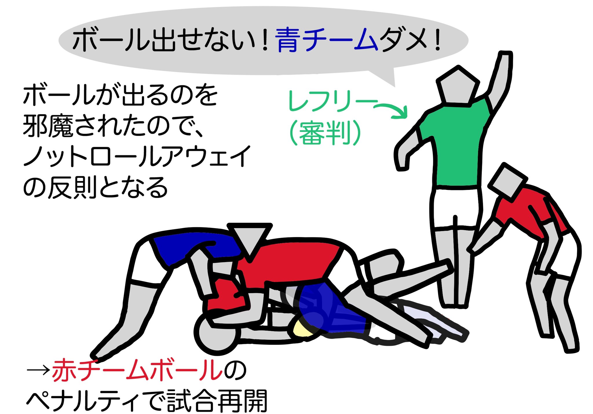タックルをした選手は、倒れたままボールが出てくるのを邪魔してはならない。タックラーは相手の球出しの邪魔にならないようにすぐその場から離れなければならず、離れられない場合はノットロールアウェイの反則となる。
