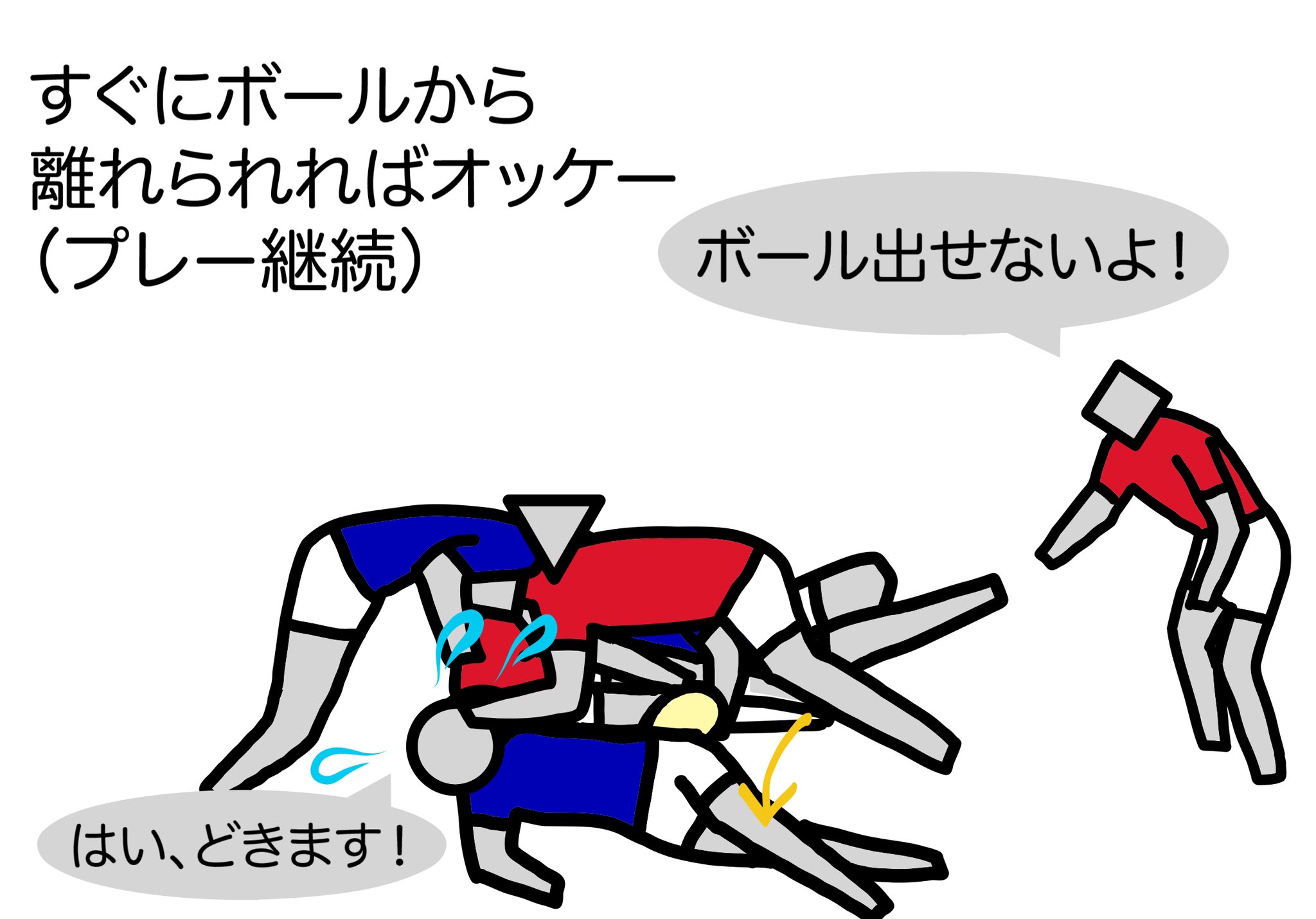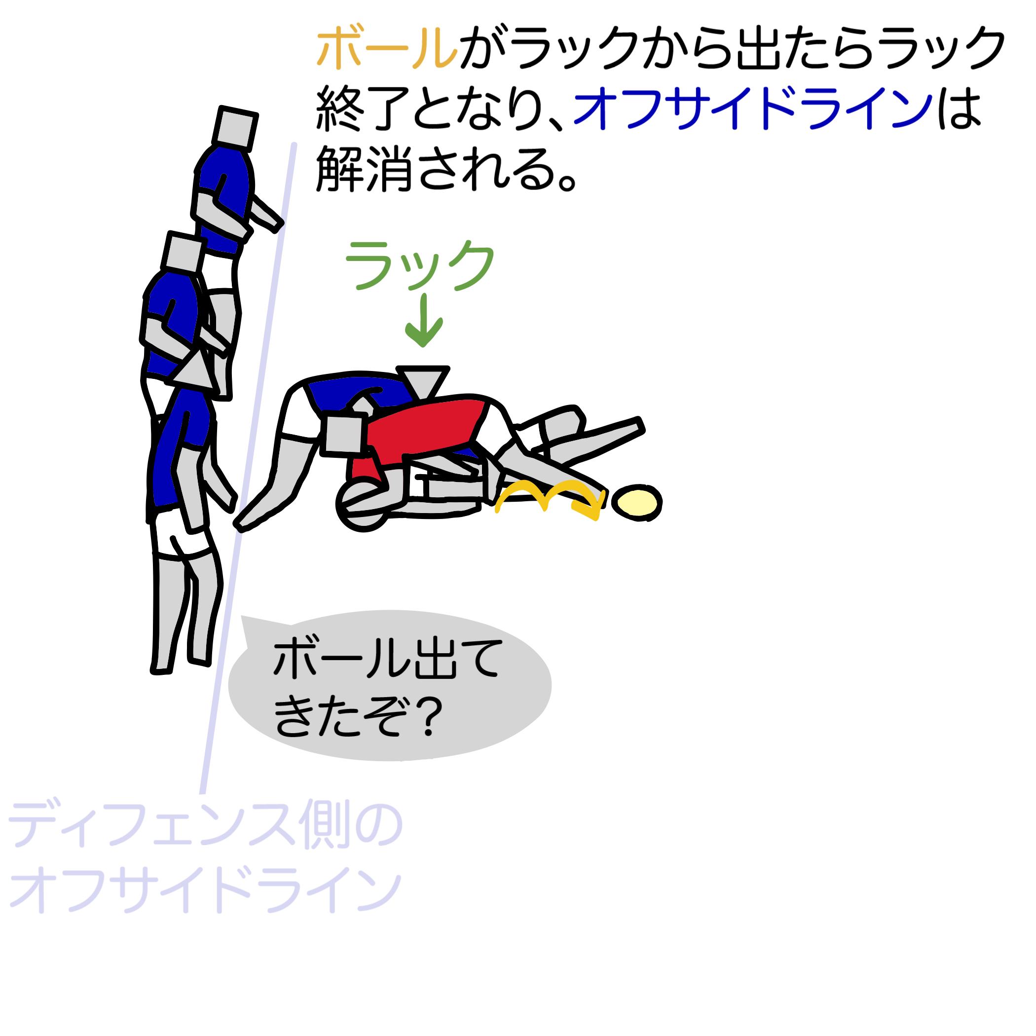 ラック参加プレイヤーの足の下にボールがある間はオフサイドラインが適応されるが、ボールが足の下から出ればオフサイドラインが解消される。