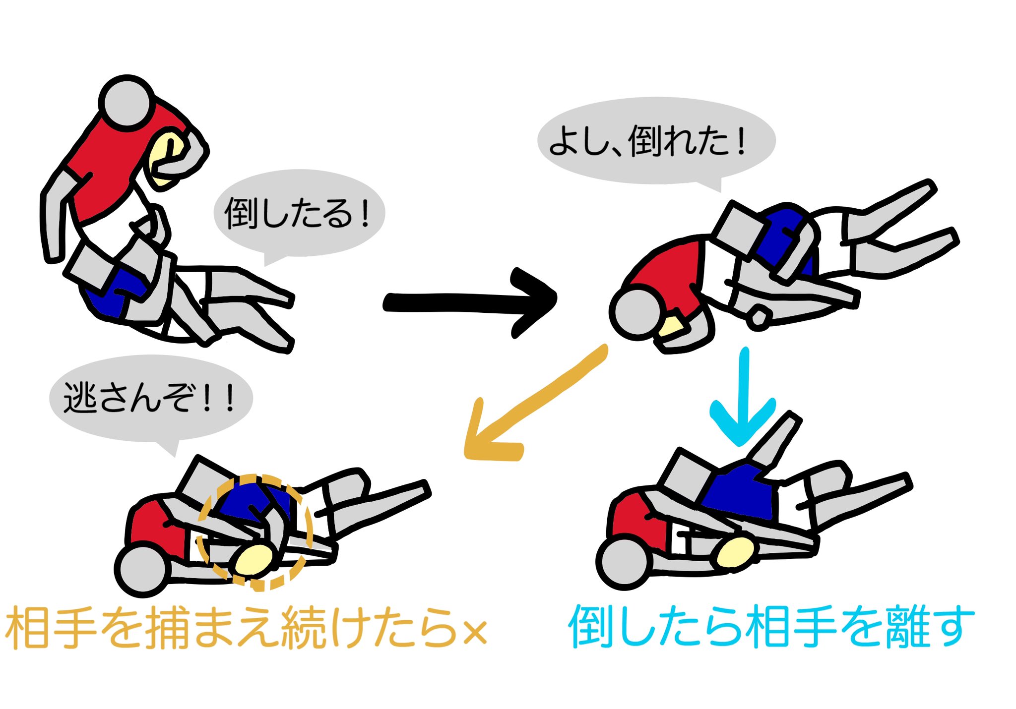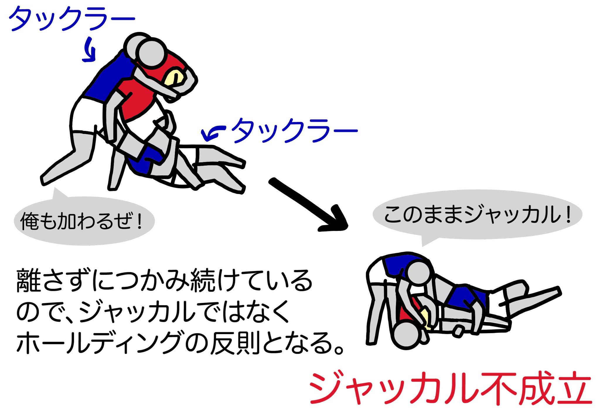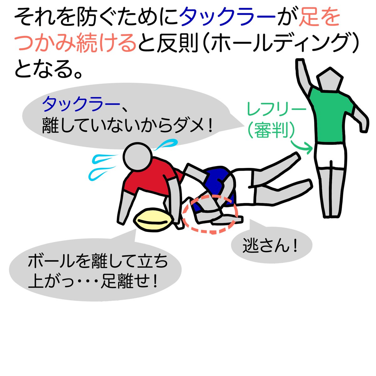 タックルをした選手は、倒した相手をいったん離さなければならない。離さずに捕まえ続けているとホールディングの反則となる。