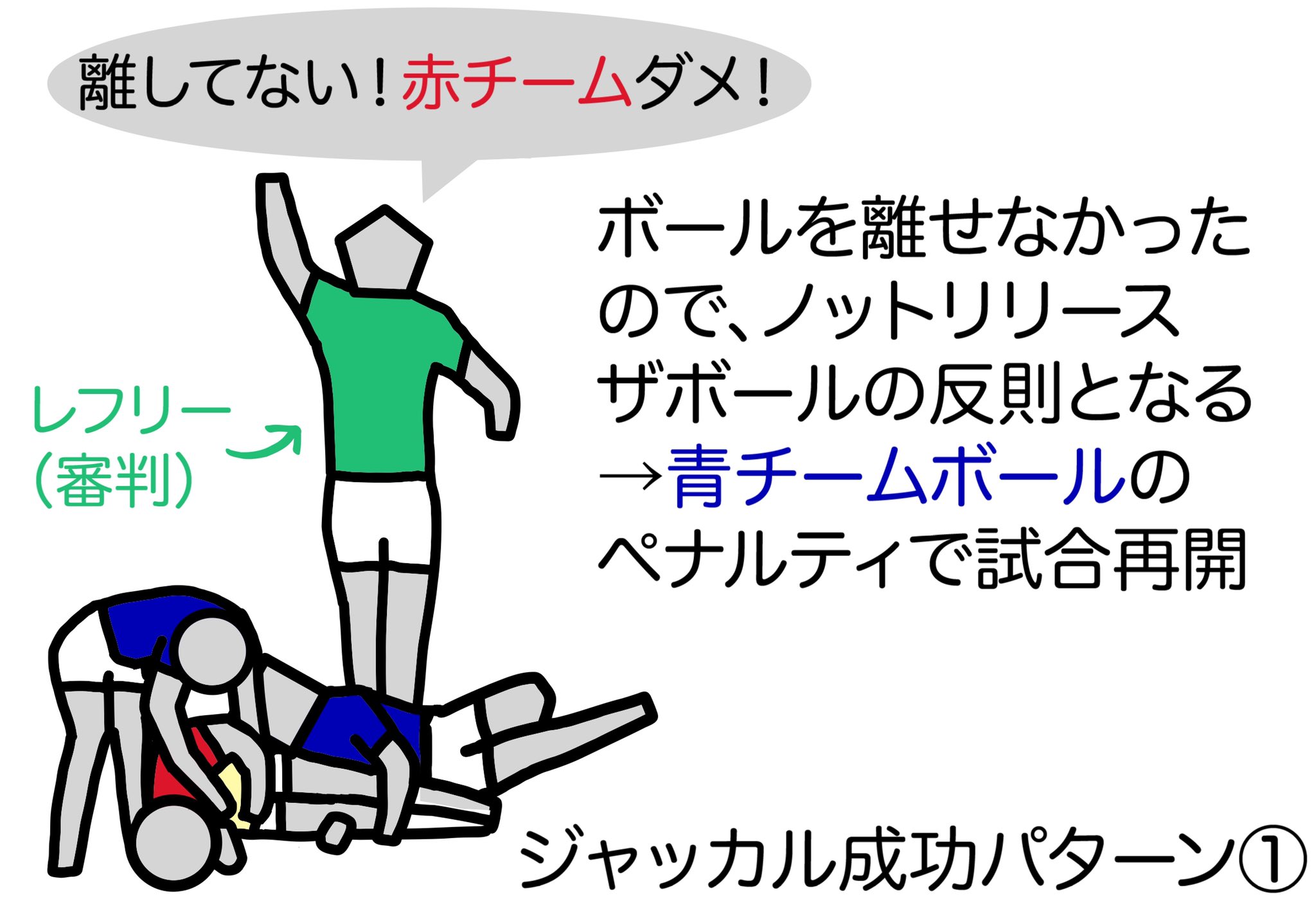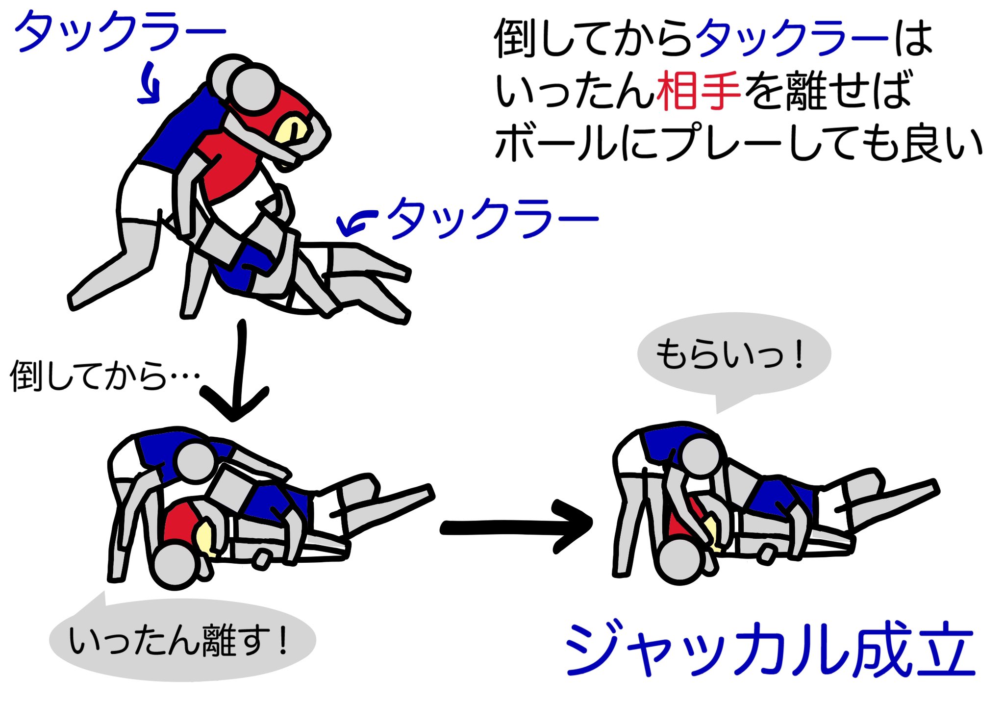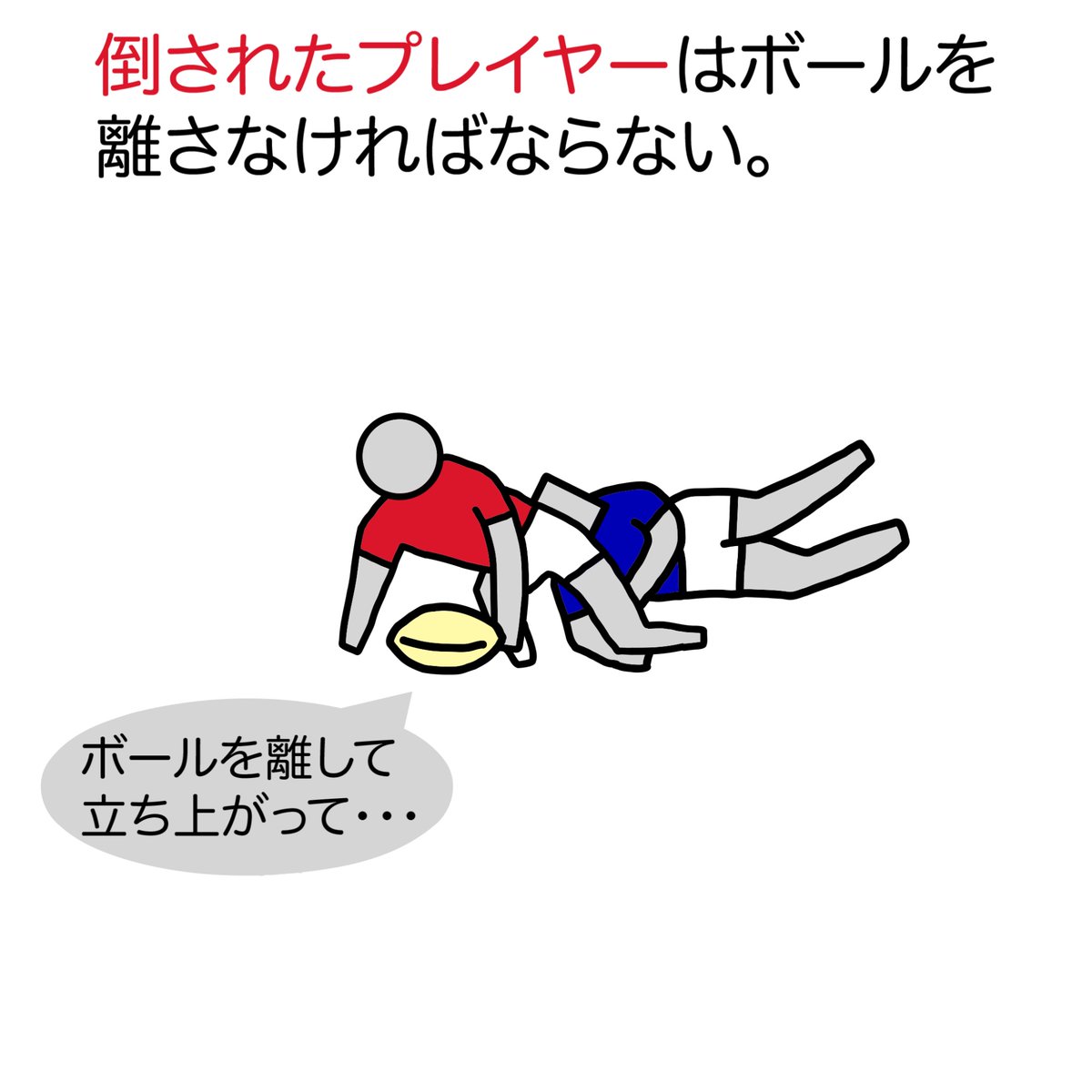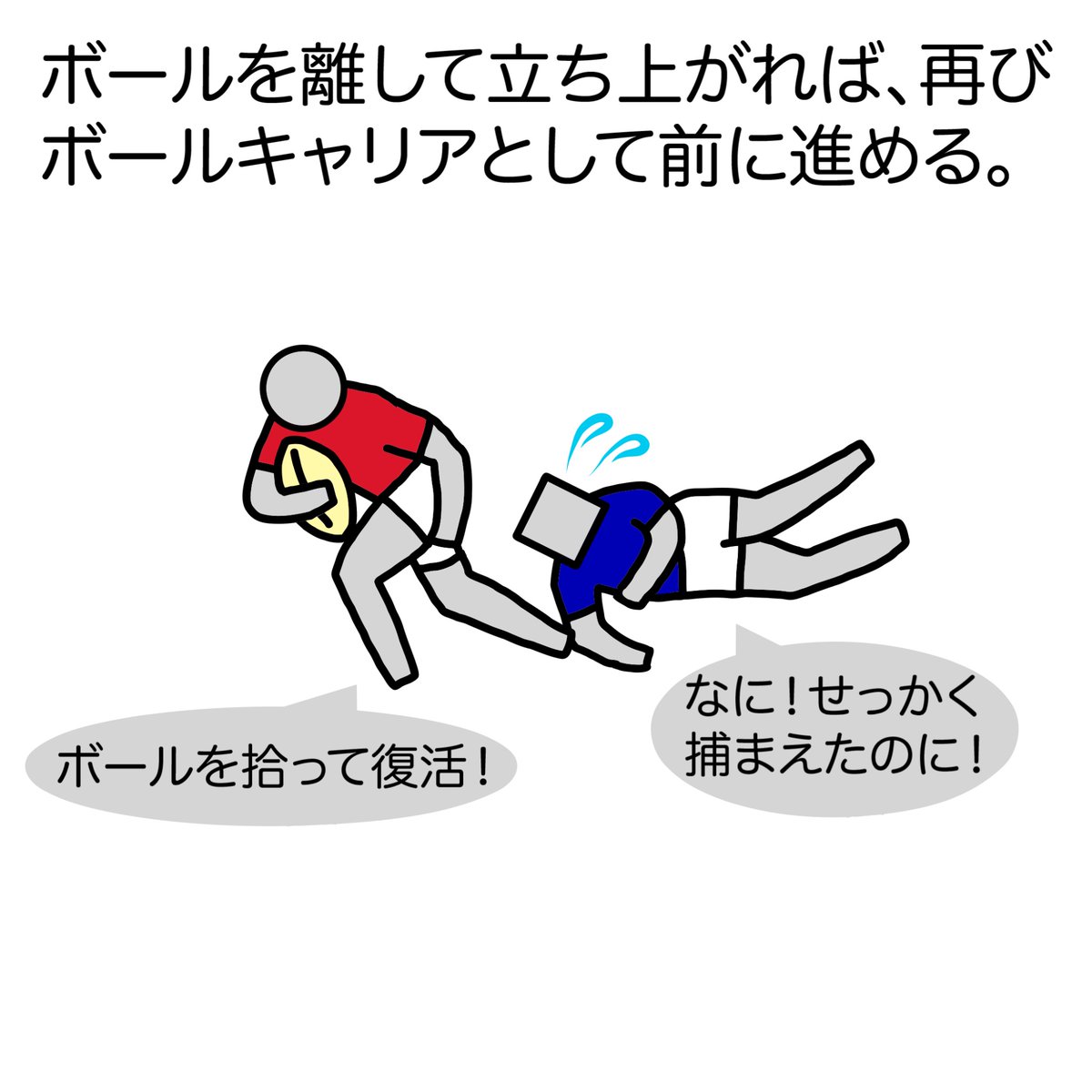 タックルをされて倒れたらボールを一度離さなければならないが、倒されてからボールを離して立ち上がれば、もう一度ボールを持ち出してもよい。