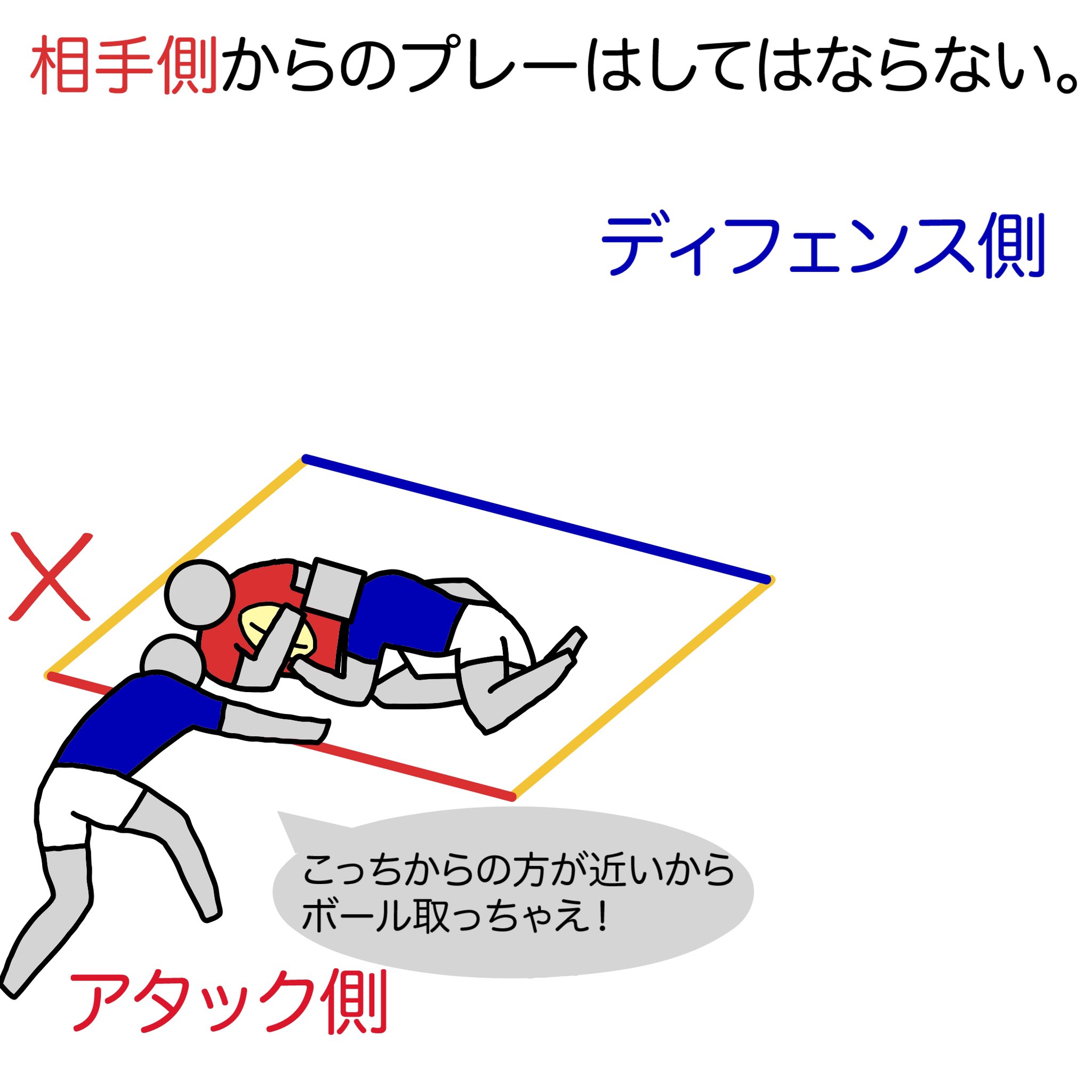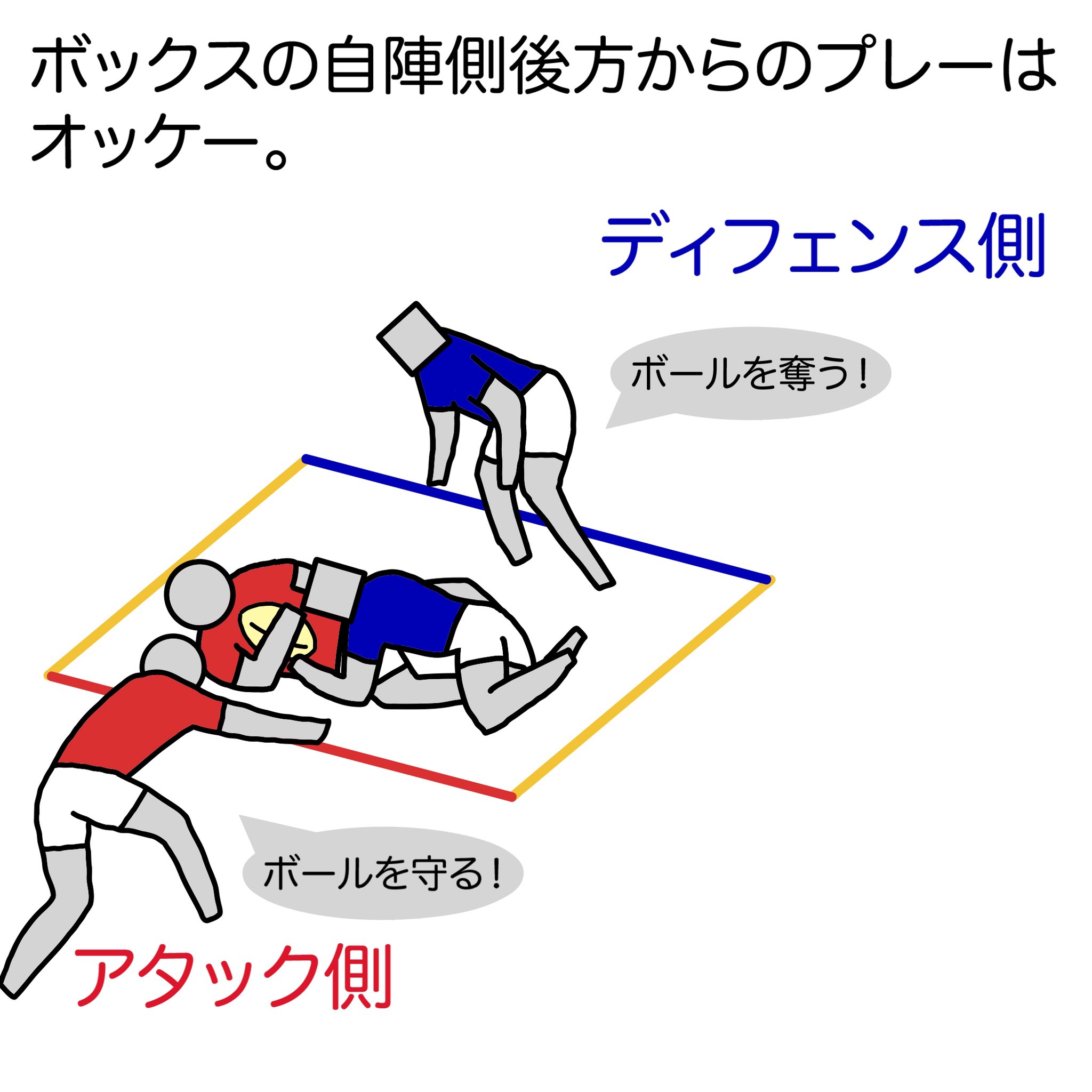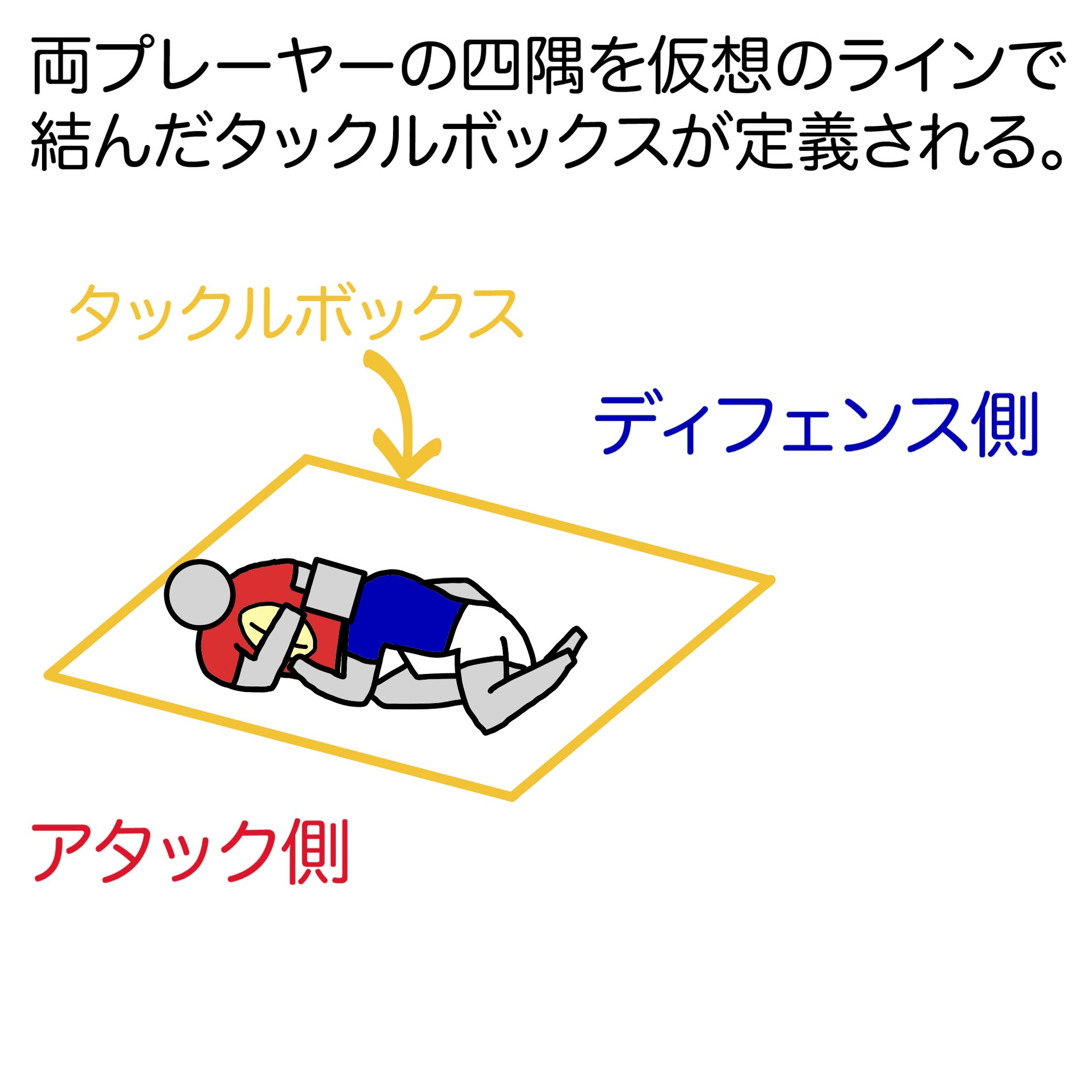 タックルが起きると倒れている両プレイヤーの四隅を仮想のラインで結んだタックルボックスが定義される。ボールにプレーする場合、自陣側後方からプレーしなければならない。相手側や横からプレーすると反則(オフザゲート)になる。