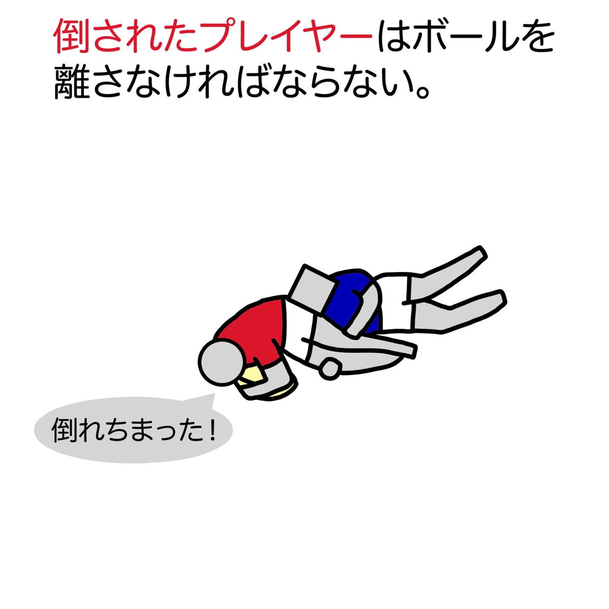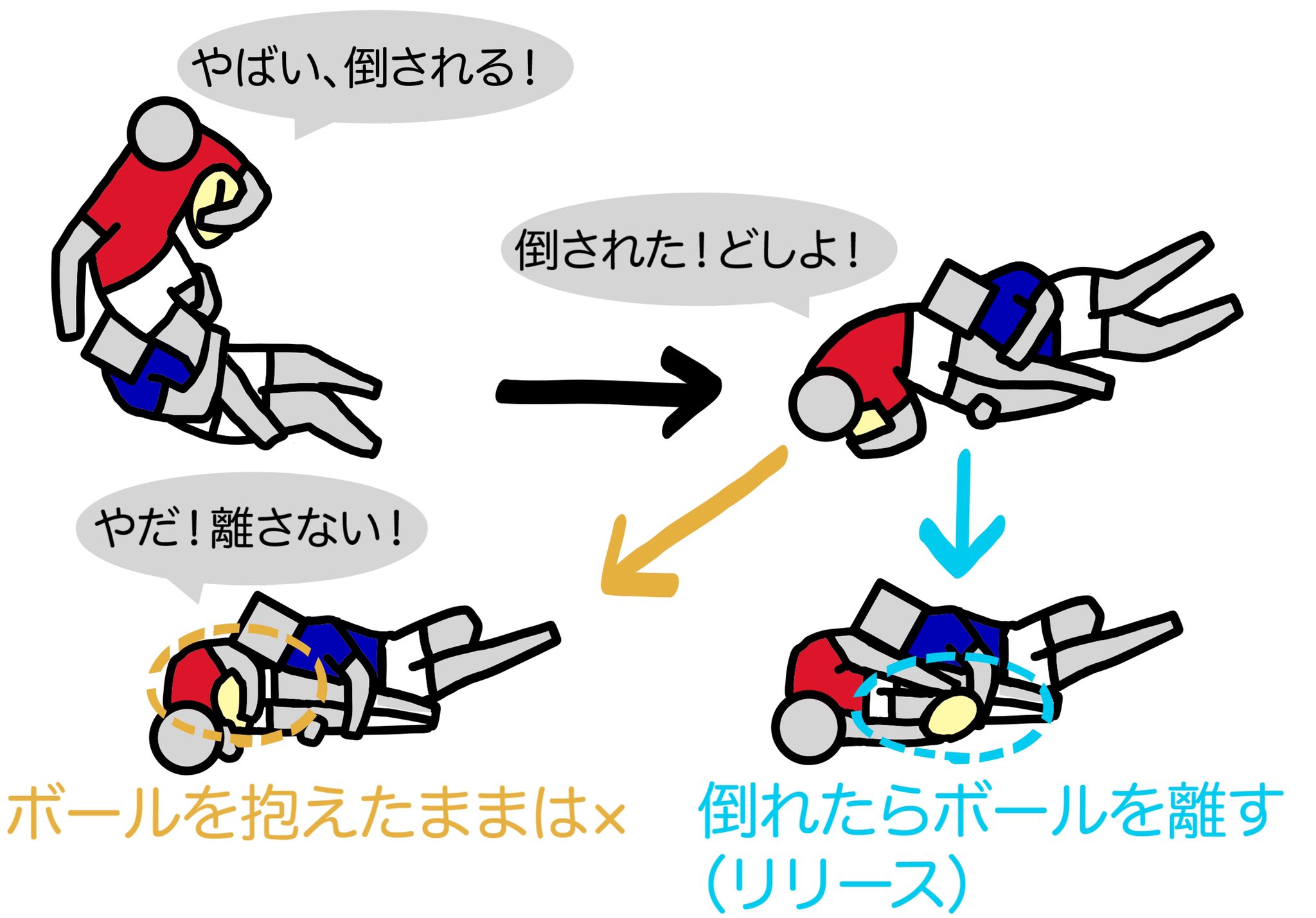 タックルをされ、地面に倒れたらボールを離さなければならない。ボールを離させない、あるいは離されたボールを奪うスチールというプレーがある。ボールを離さないとノットリリースザボールの反則となる。