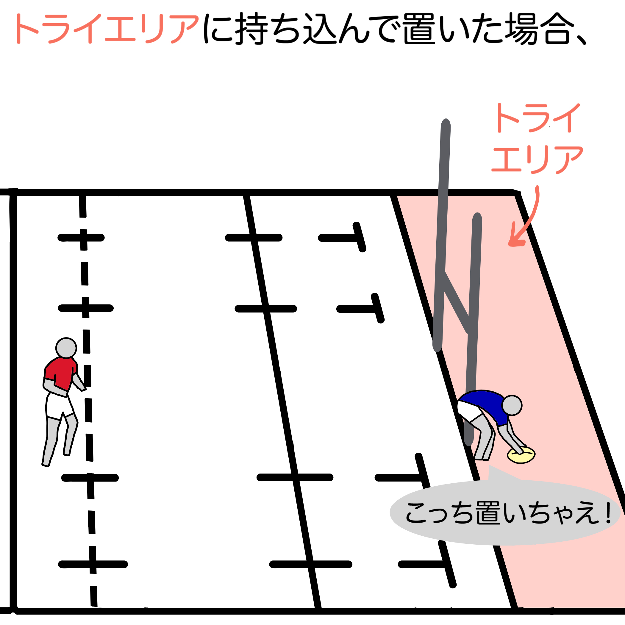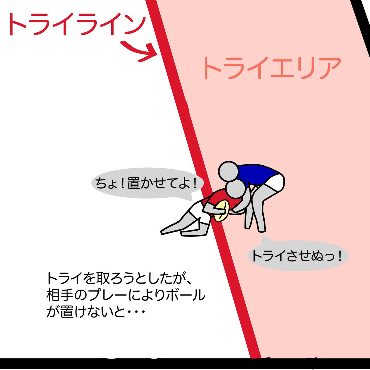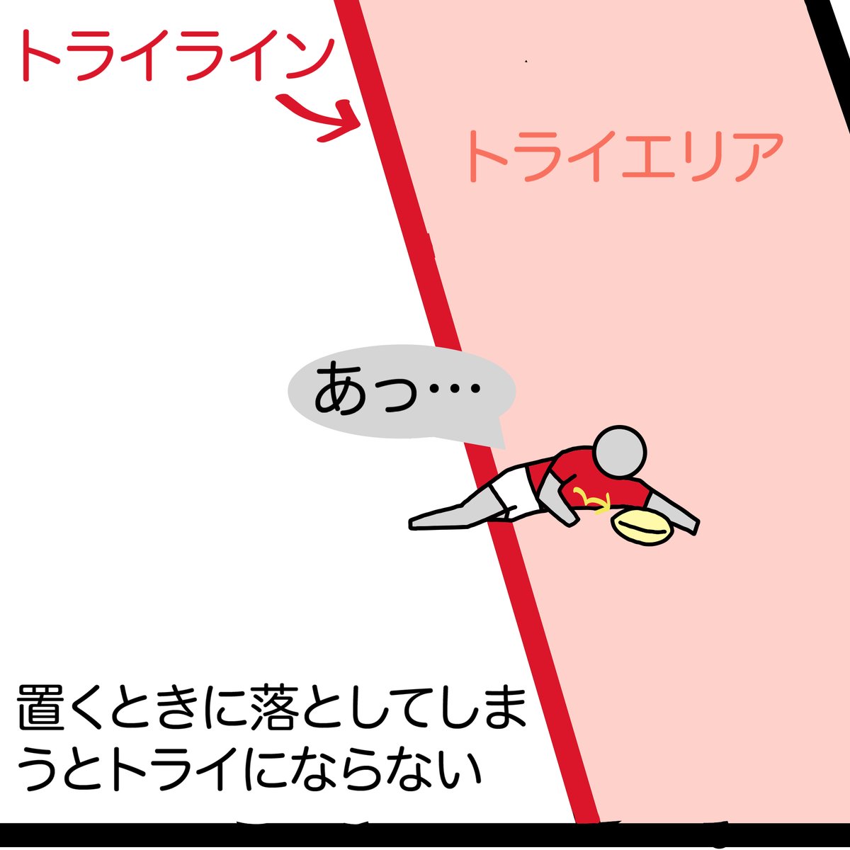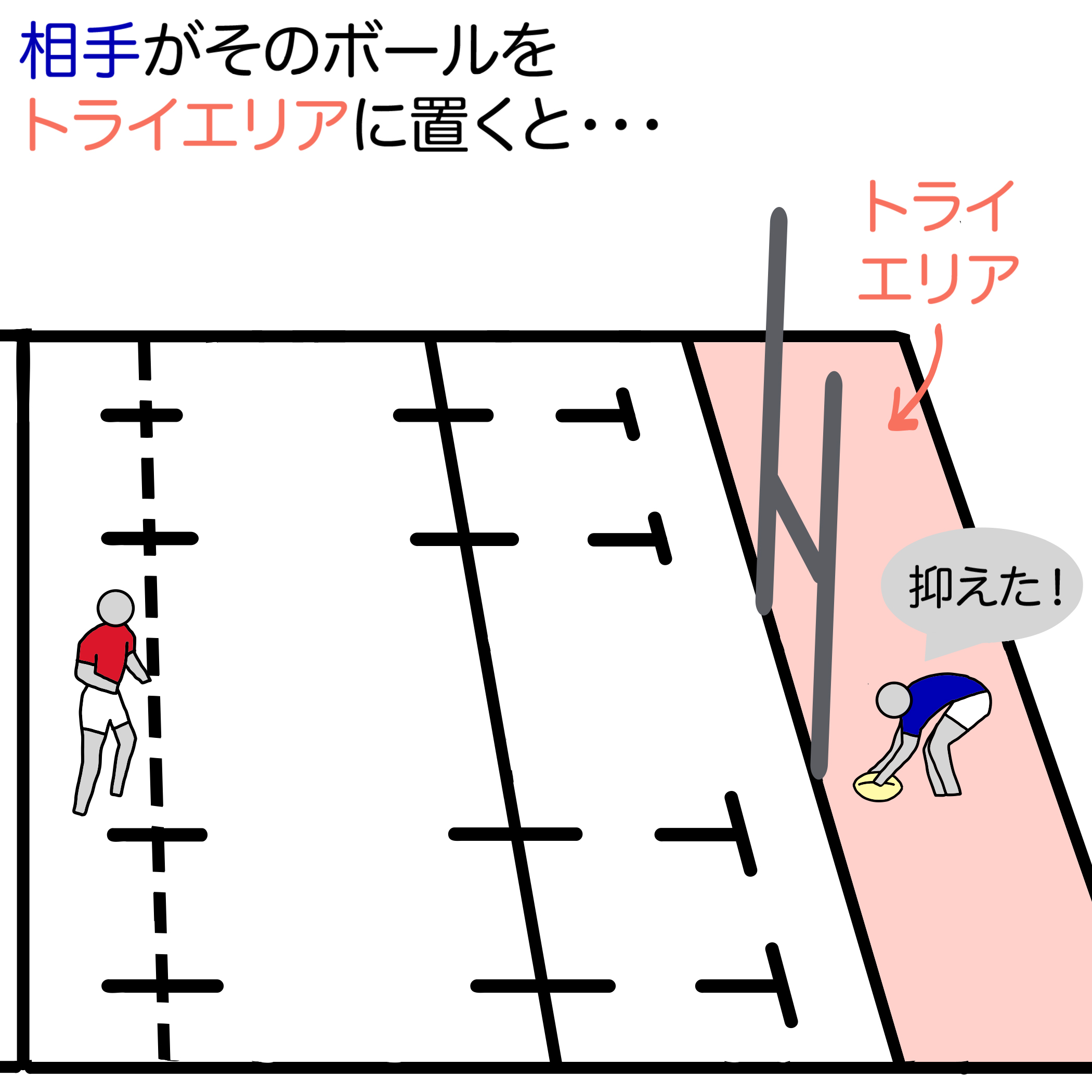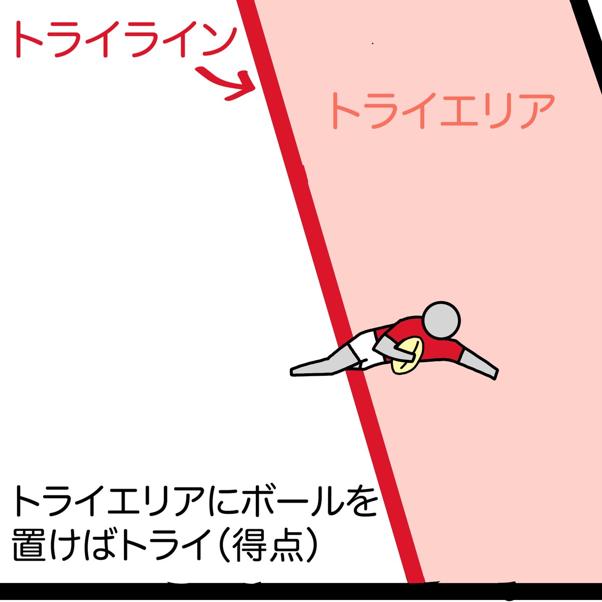 トライエリアにボールを置けばトライになり、得点が入る。ボールを置く前にボールを落としたり、トライエリアに入っても相手のプレーによりボールを置けなかった場合は得点にならない。