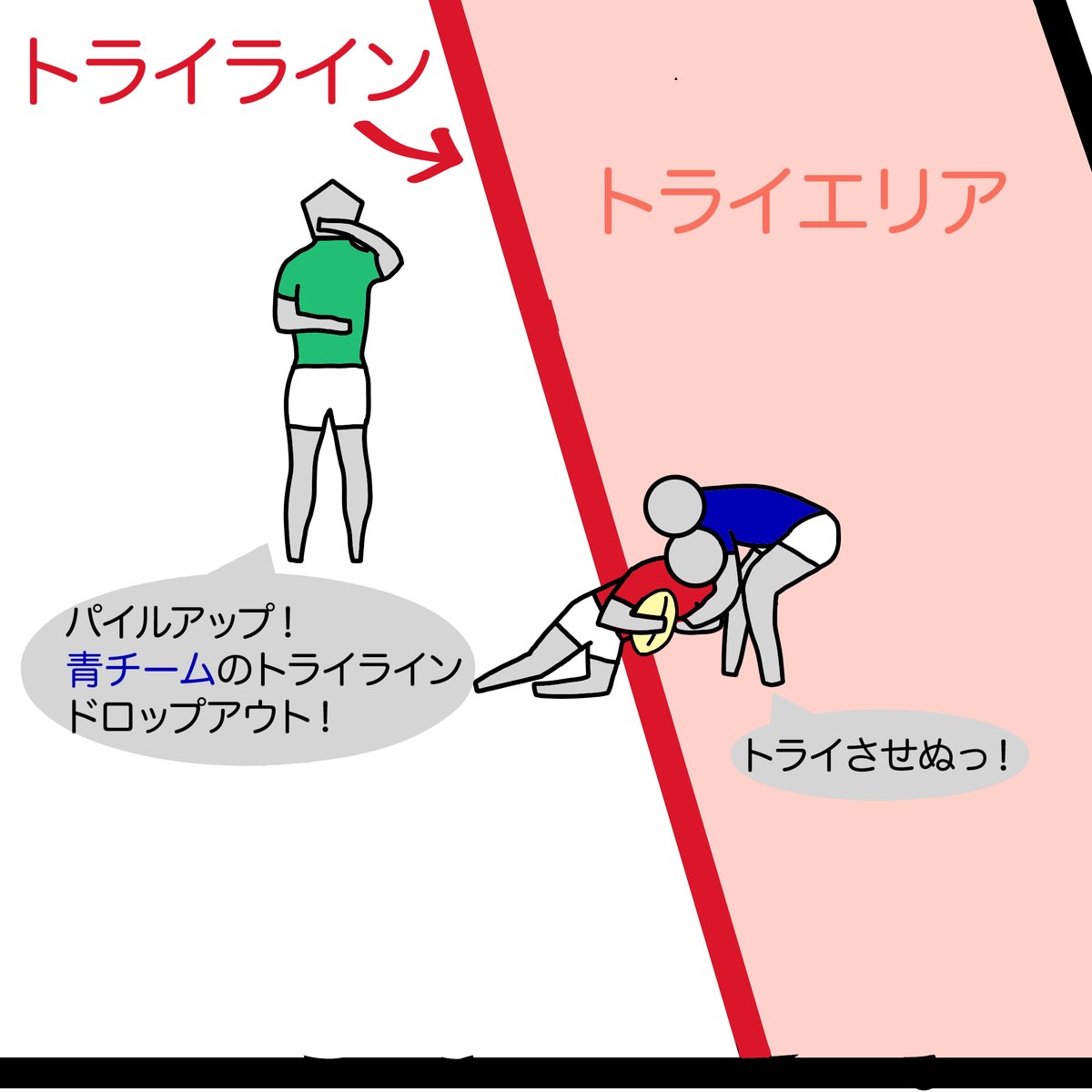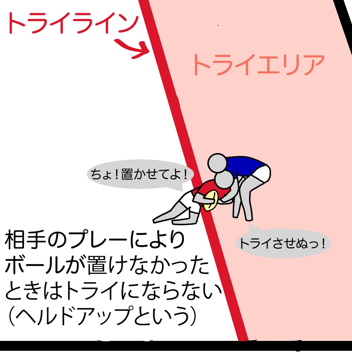 トライエリアに入ったが、相手のプレーによりボールを置けなかった場合はパイルアップとなり得点にならない。トライエリア内のパイルアップ(ヘルドアップ)はトライを防いだ側のトライラインドロップアウトで再開される。