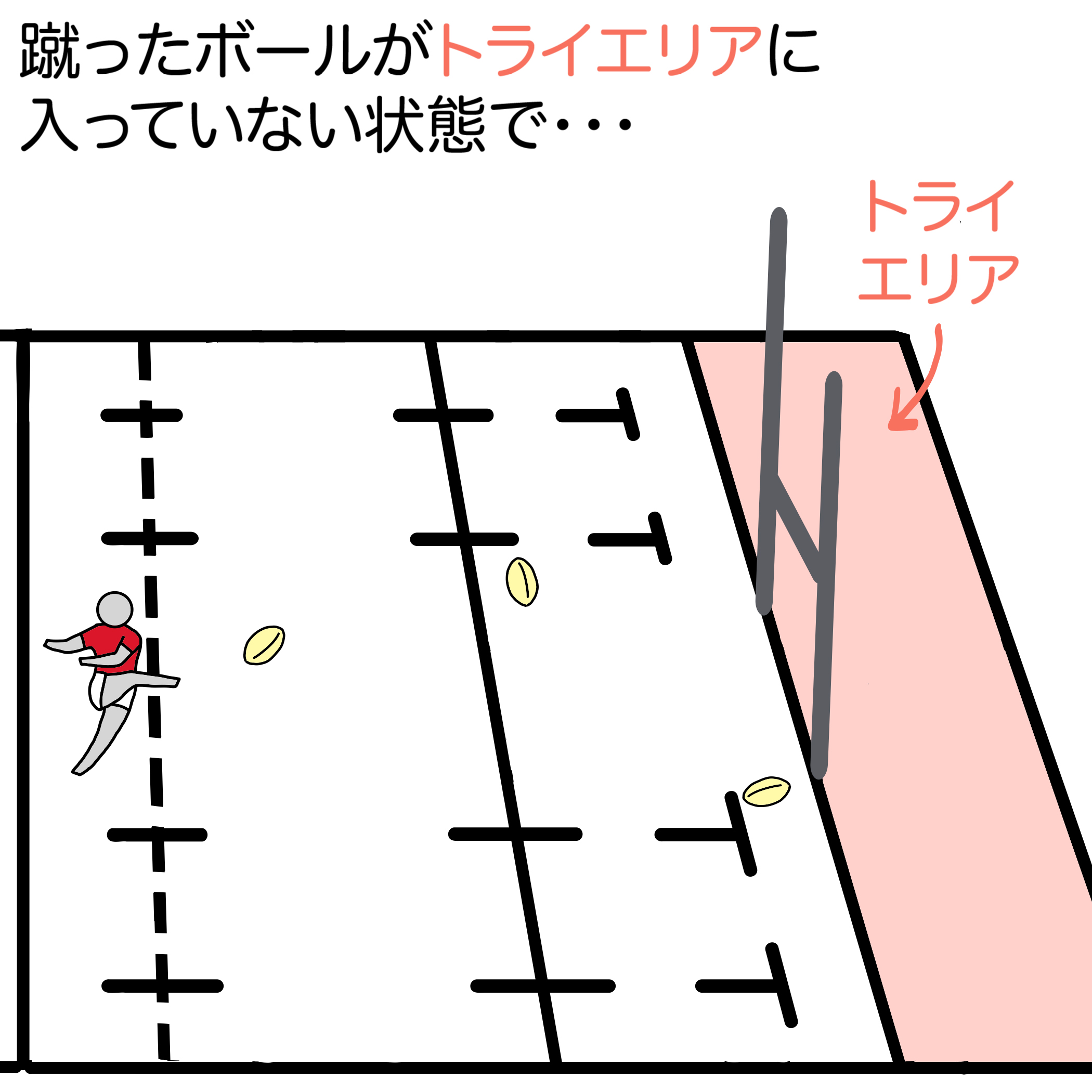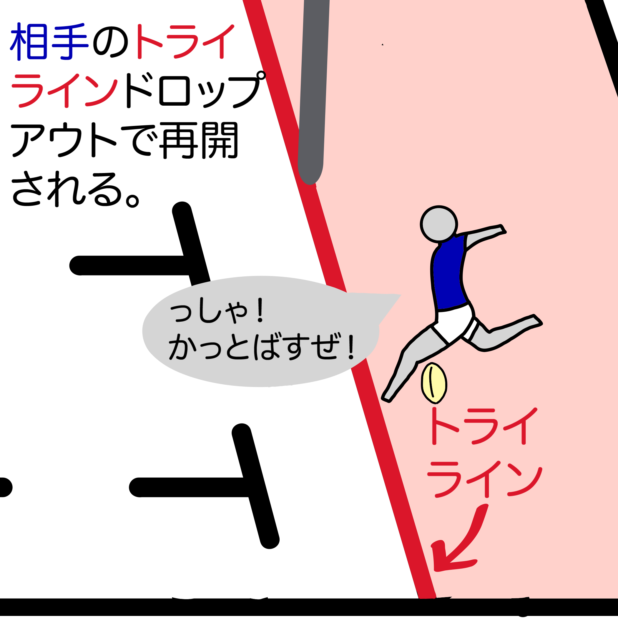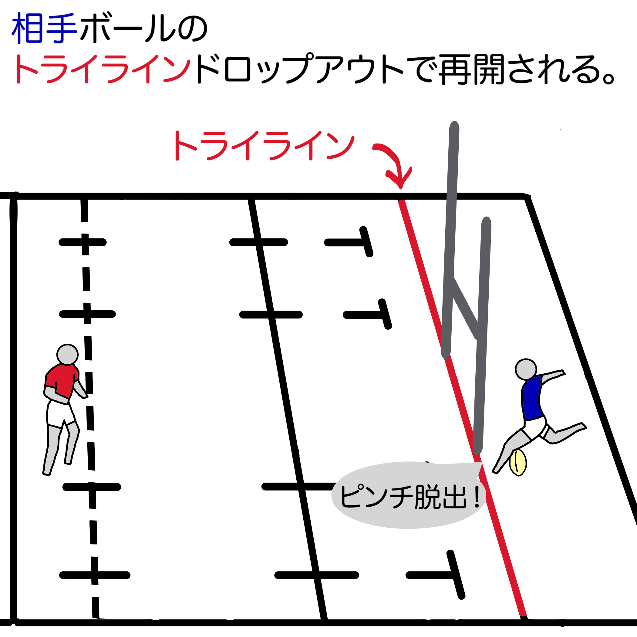 攻撃側が蹴ったボールがトライエリアに入り、防御側がそのボールをトライエリアに置いた場合、トライラインドロップアウトで再開される。