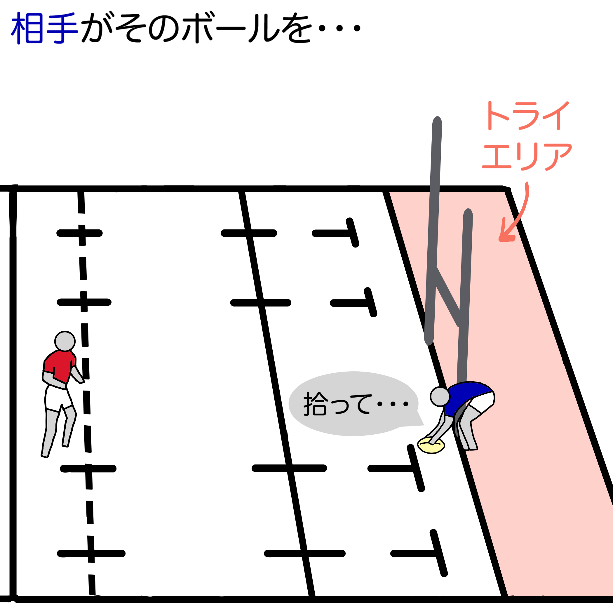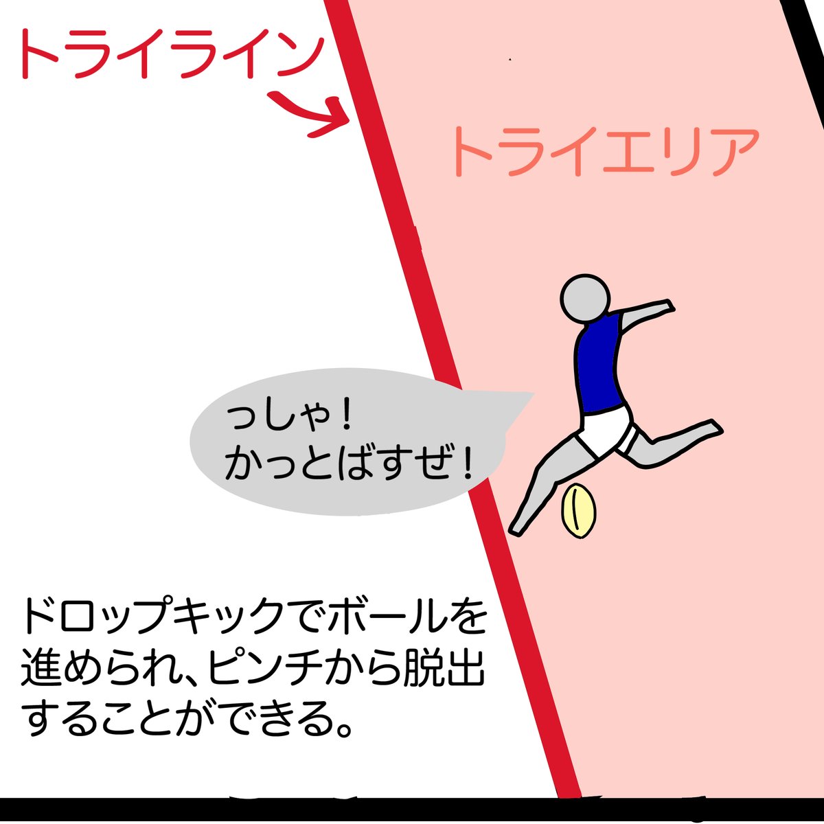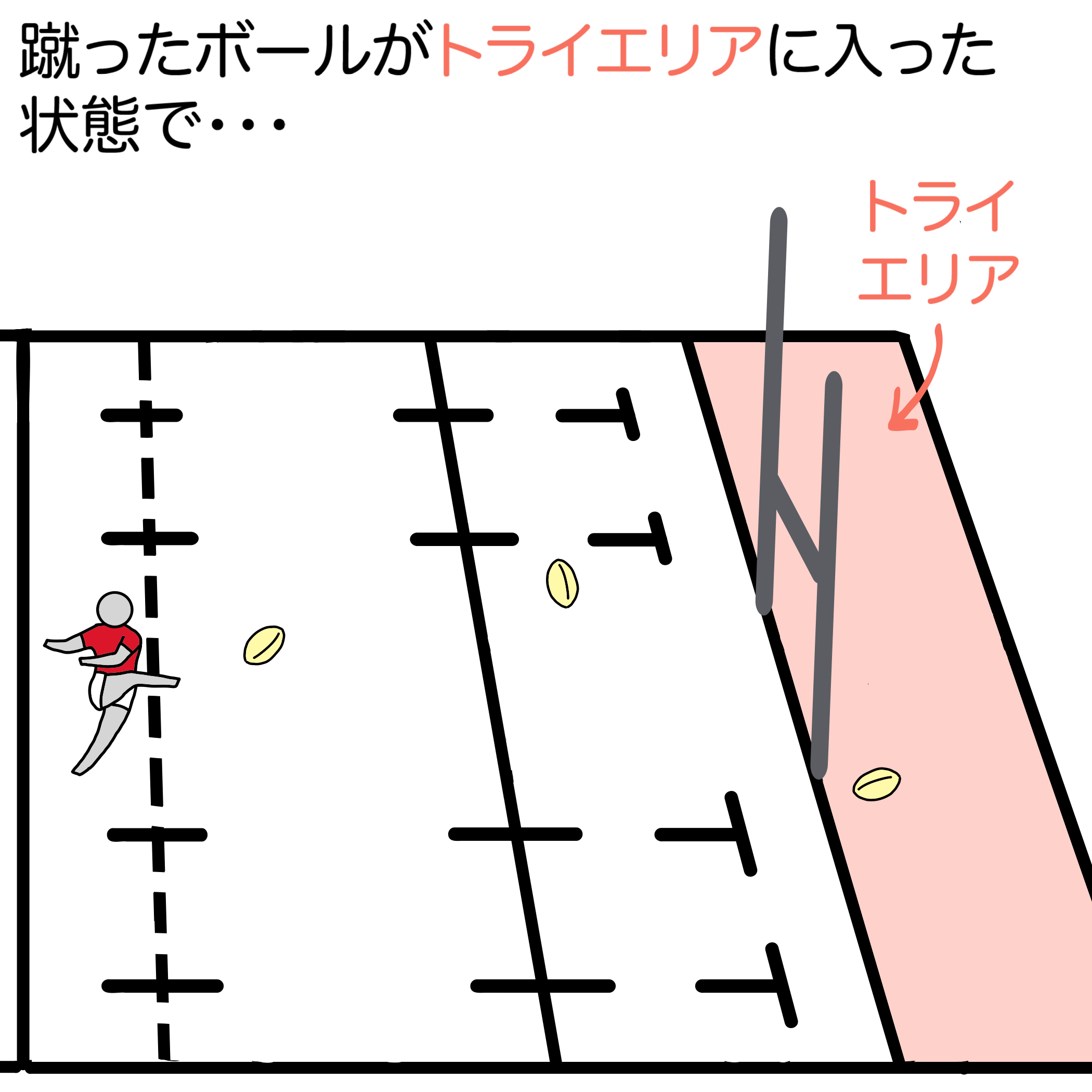 攻撃側が蹴ったボールがトライエリアに入り、防御側がそのボールをトライエリアに置いた場合、トライラインドロップアウトで再開される。