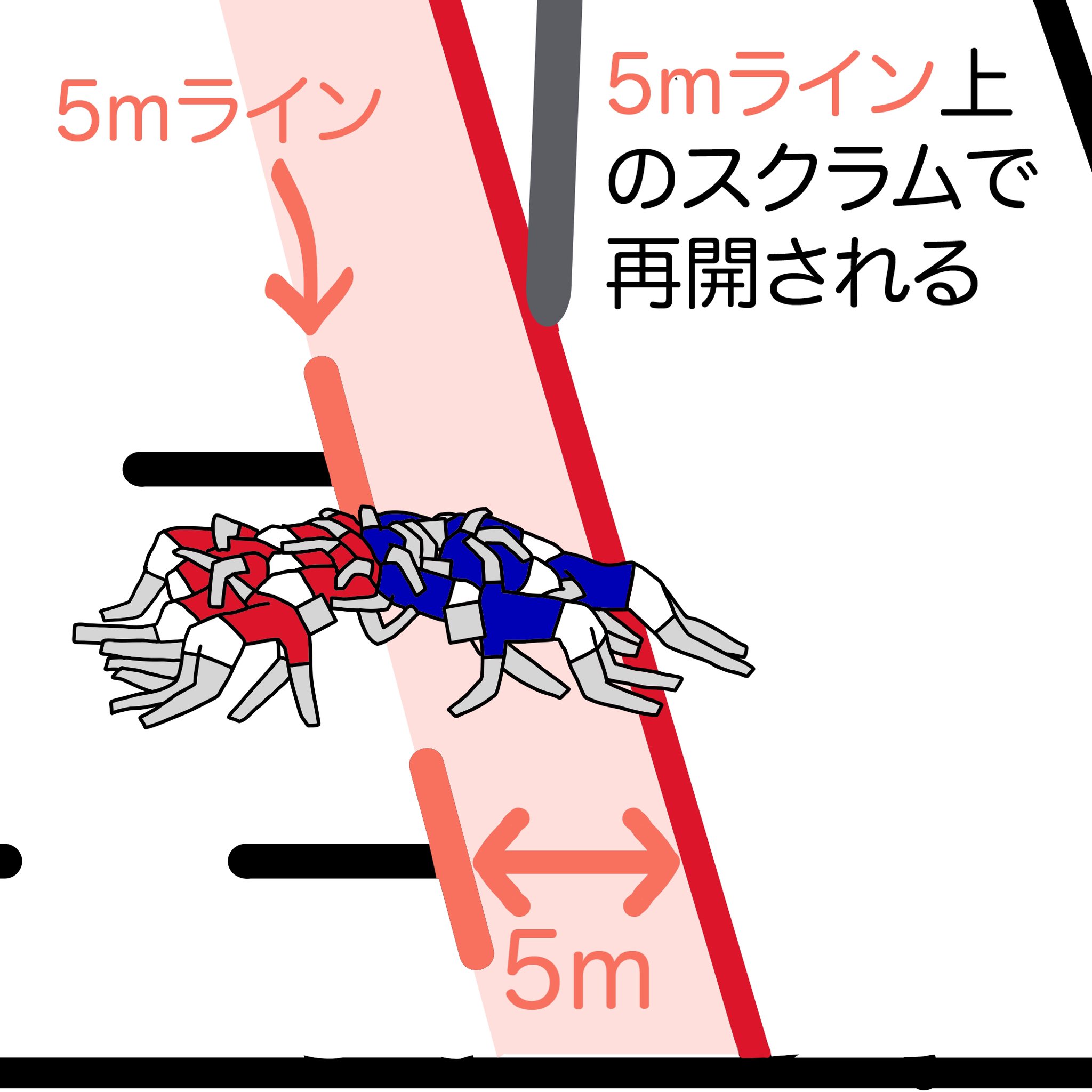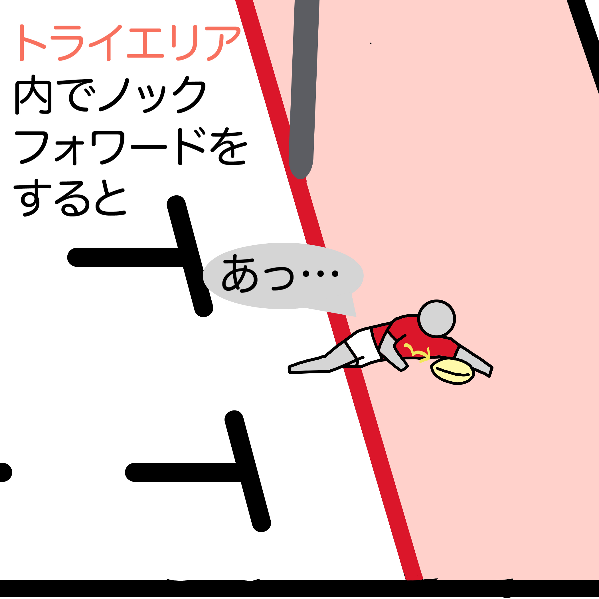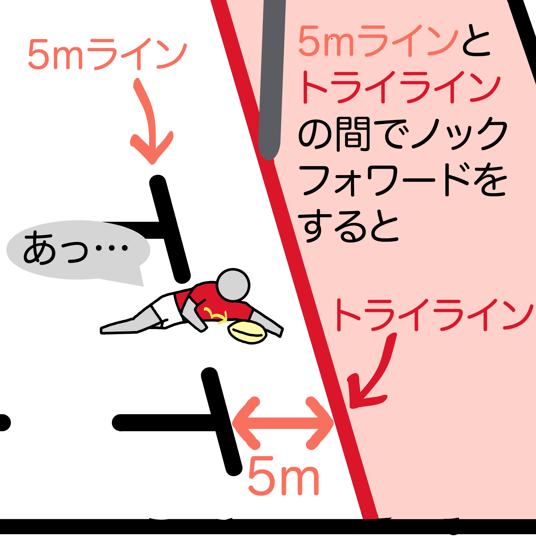 5mラインとトライラインの間でノックフォワード(あるいはスローフォワード)があった場合、ノックフォワードがあった場所ではなく、5mライン上でのスクラムで再開される。トライエリア内の場合、トライラインドロップアウトで再開される。