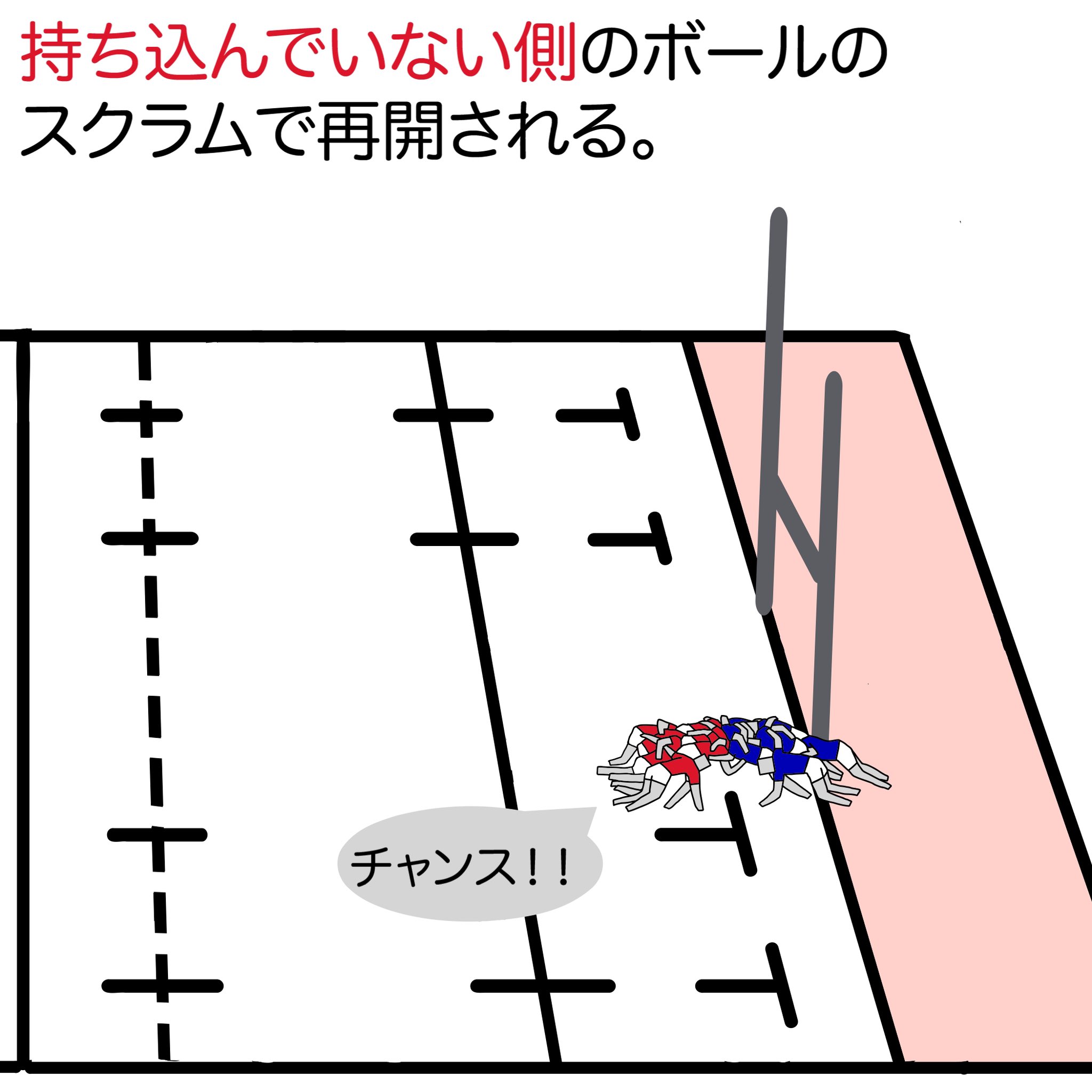 攻撃側が蹴ったボールがトライエリアに入らず、防御側が自らトライエリアに持ち込んで置いた場合、置いた場所から5m下がった場所で持ち込んでいない側のボールのスクラムで再開される。
