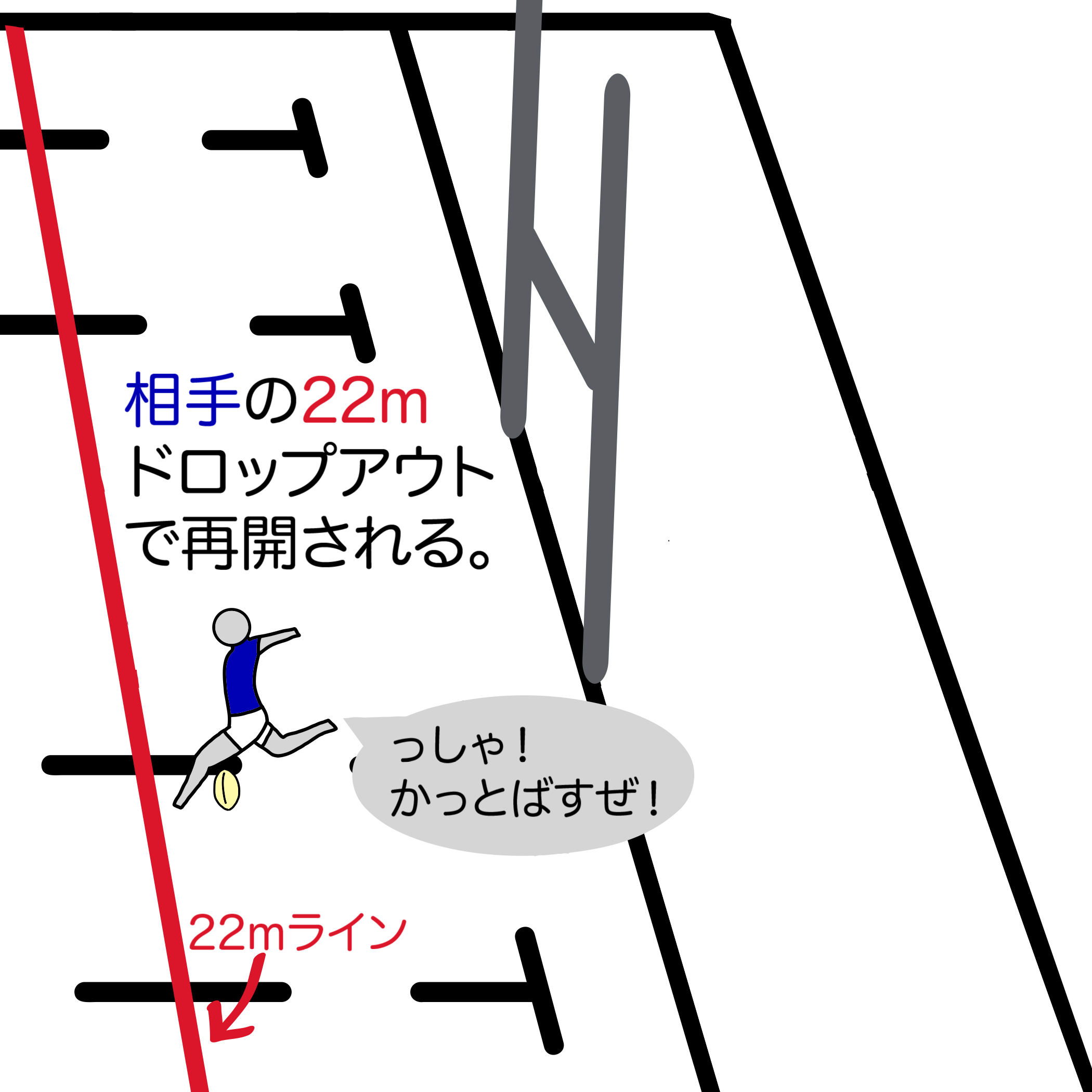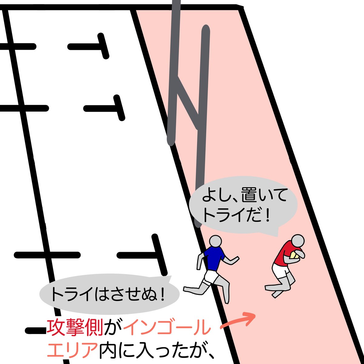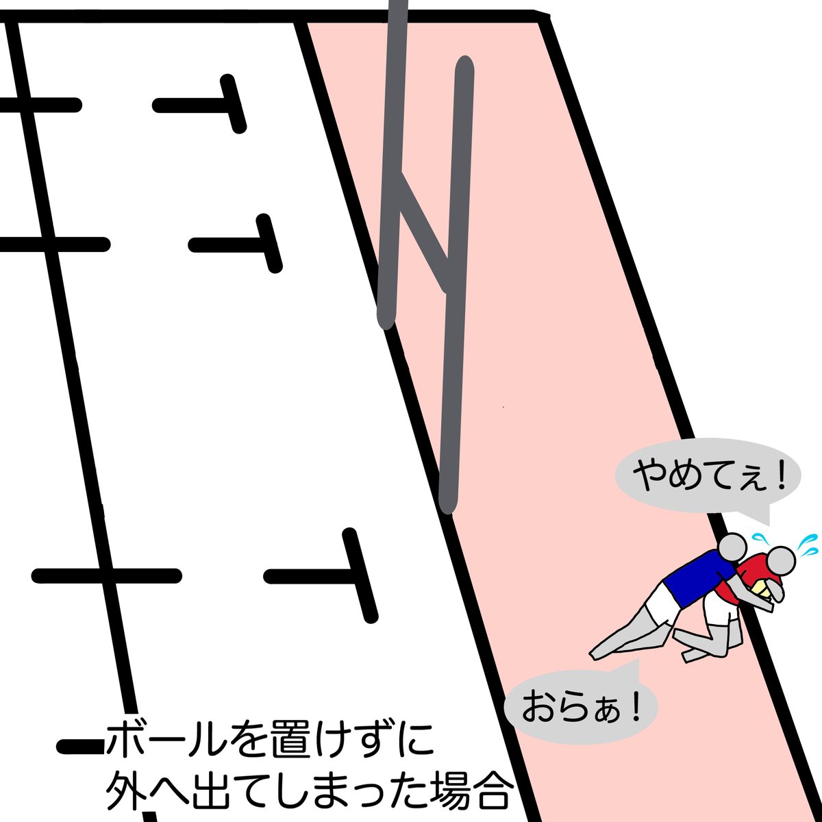 攻撃側がインゴールに入ったが、ボールを置けずに外に出てしまった場合、防御側ボールの22mドロップアウトで再開される。